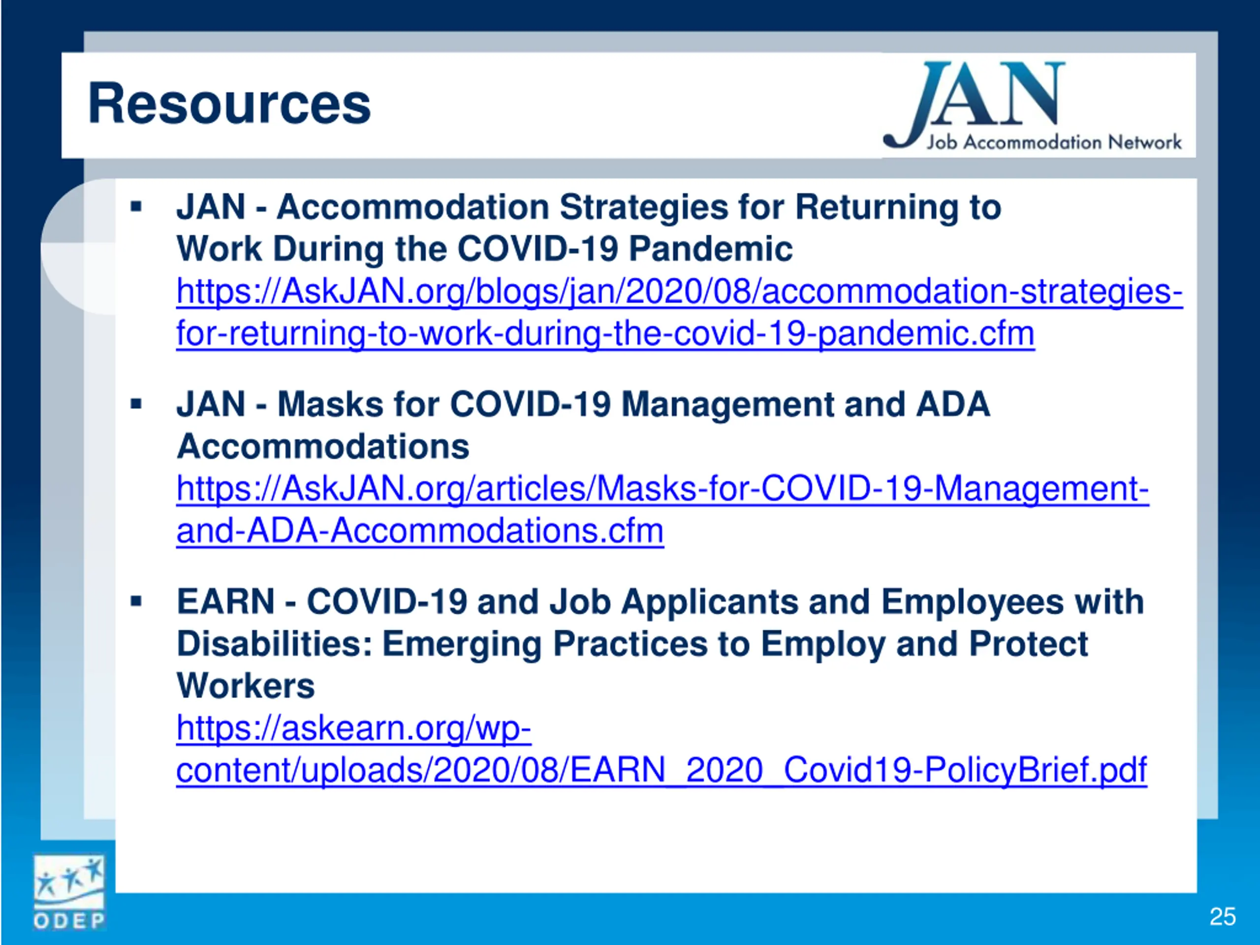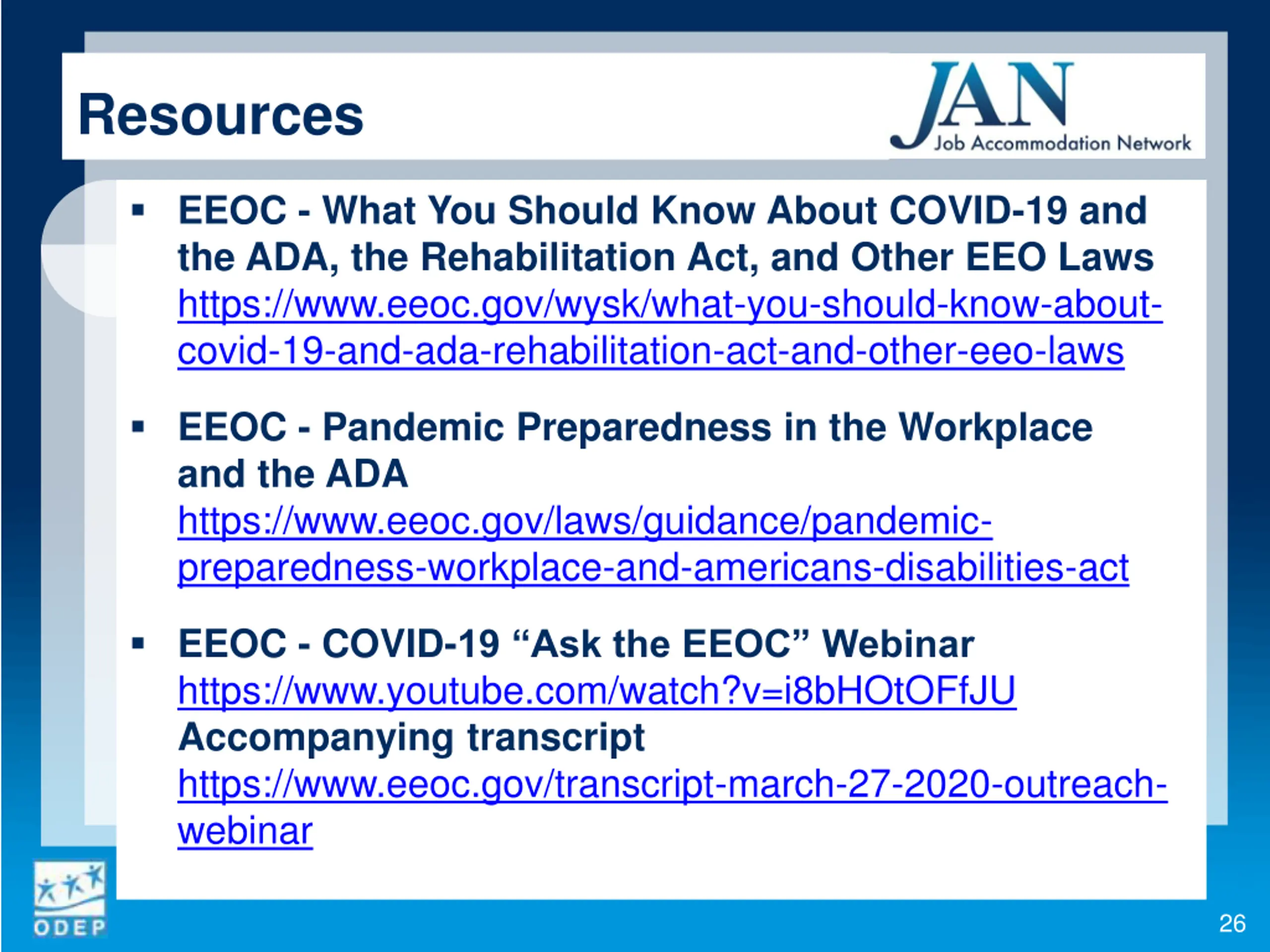 Resources JAN - Accommodation Strategies for Returning to Work During the COVID-19 Pandemic https://AskJAN.org/blogs/jan/2020/08/accommodation-strategies- for-returning-to-work-during-the-covid-19-pandemic.cfm JAN - Masks for COVID-19 Management and ADA Accommodations https://AskJAN.org/articles/Masks-for-COVID-19-Management- and-ADA-Accommodations.cfm EARN - COVID-19 and Job Applicants and Employees with Disabilities: Emerging Practices to Employ and Protect Workers https://askearn.org/wp- content/uploads/2020/08/EARN_2020_Covid19-PolicyBrief.pdf 25