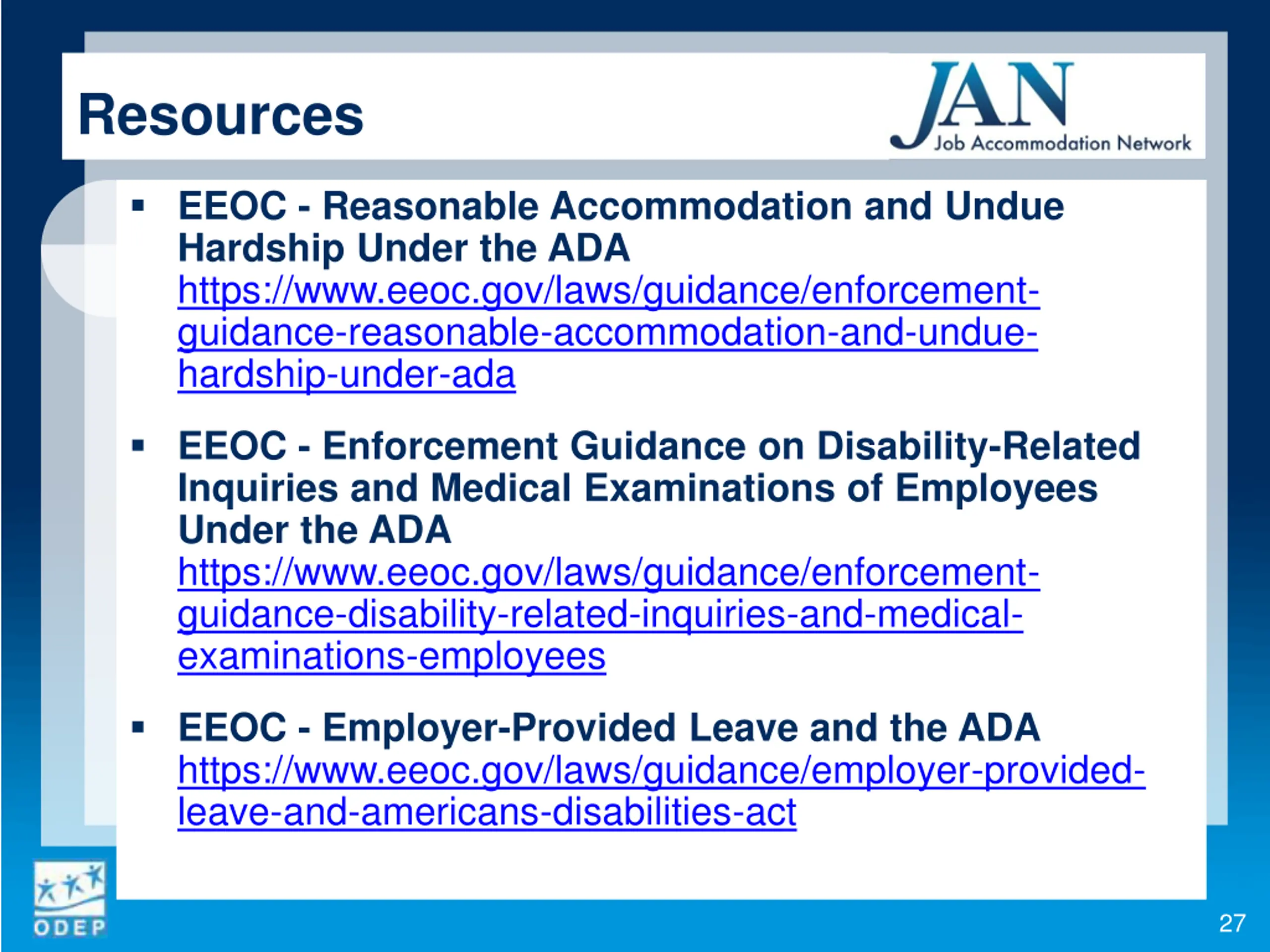 Resources EEOC - Reasonable Accommodation and Undue Hardship Under the ADA https://www.eeoc.gov/laws/guidance/enforcement- guidance-reasonable-accommodation-and-undue- hardship-under-ada EEOC - Enforcement Guidance on Disability-Related Inquiries and Medical Examinations of Employees Under the ADA https://www.eeoc.gov/laws/guidance/enforcement- guidance-disability-related-inquiries-and-medical- examinations-employees EEOC - Employer-Provided Leave and the ADA https://www.eeoc.gov/laws/guidance/employer-provided- leave-and-americans-disabilities-act 27