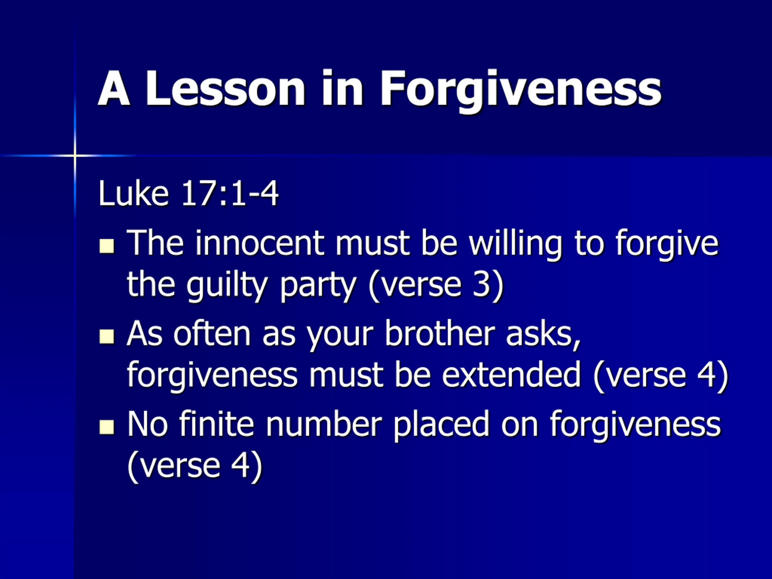 A Lesson in Forgiveness Luke 17:1-4 The innocent must be willing to forgive the guilty party (verse 3) As often as your brother asks, forgiveness must be extended (verse 4) No finite number placed on forgiveness (verse 4)