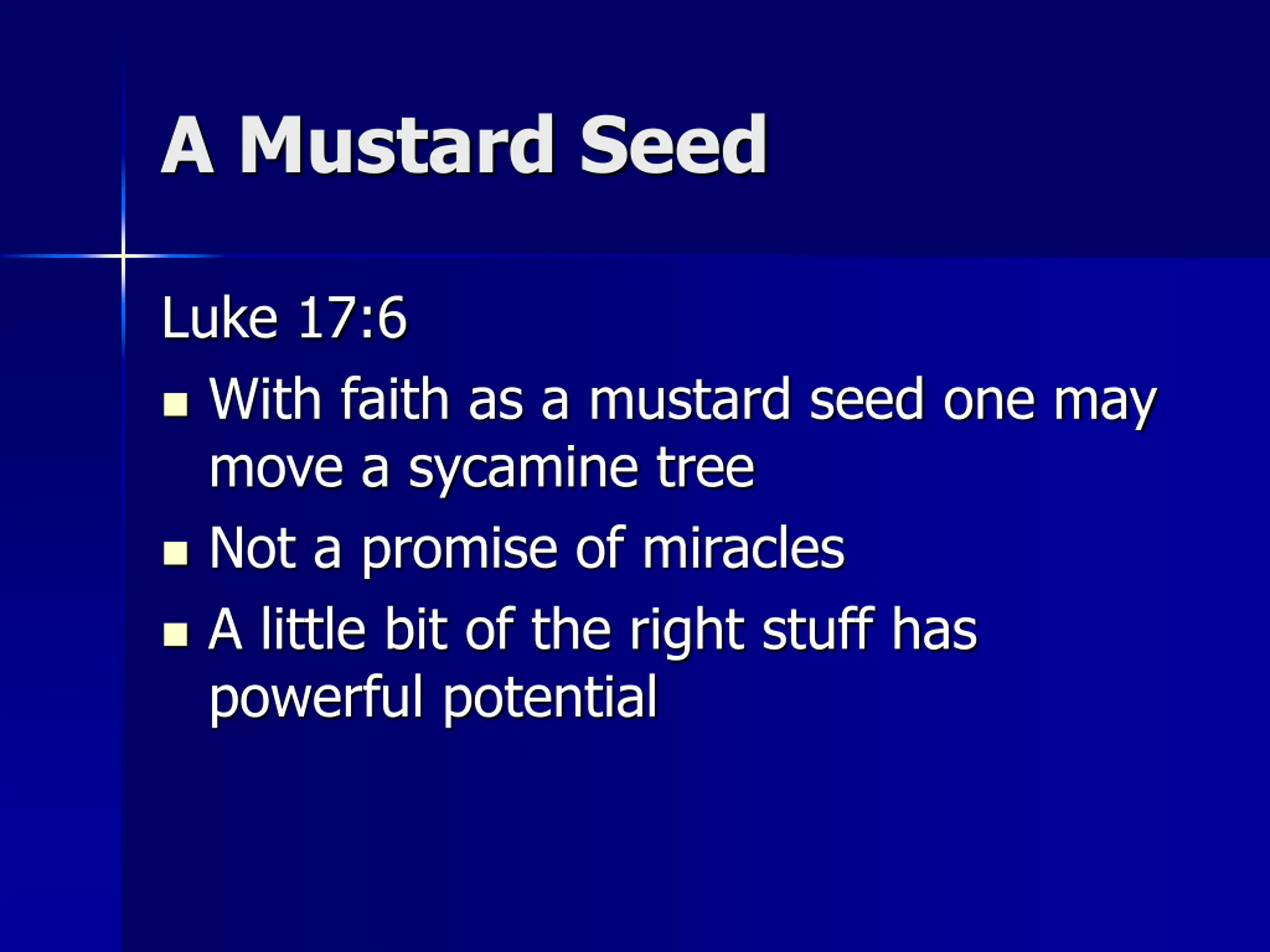 A Mustard Seed Luke 17:6 With faith as a mustard seed one may move a sycamine tree Not a promise of miracles A little bit of the right stuff has powerful potential