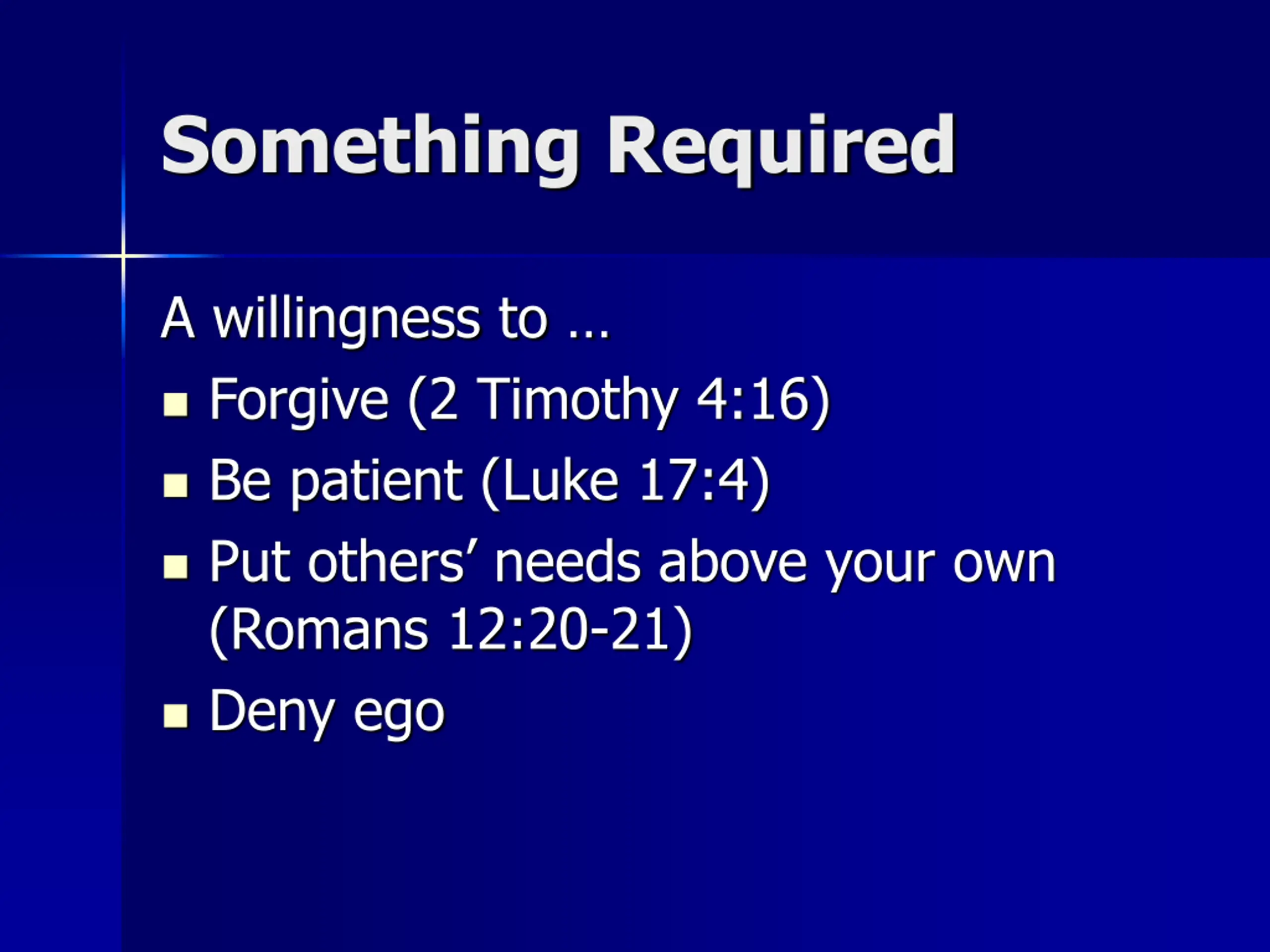 Something Required A willingness to Forgive (2 Timothy 4:16) Be patient (Luke 17:4) Put others needs above your own (Romans 12:20-21) Deny ego