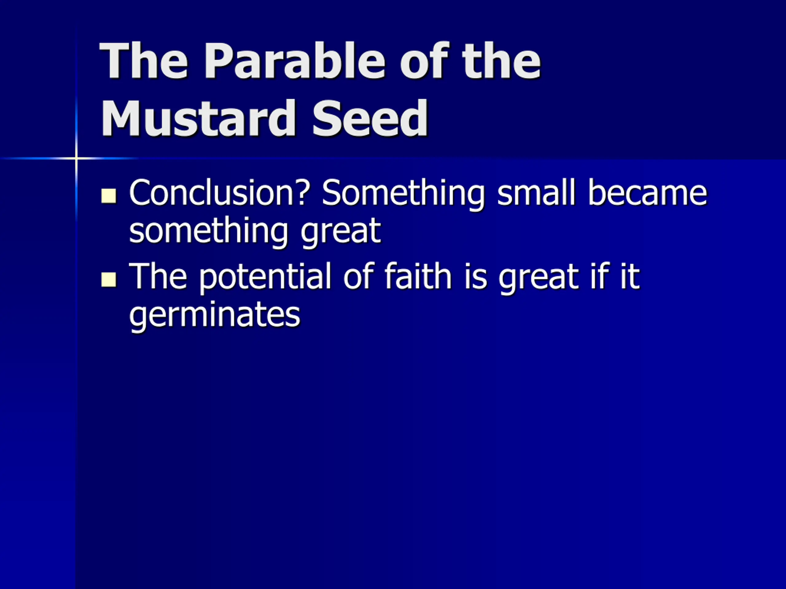 The Parable of the Mustard Seed Conclusion? Something small became something great The potential of faith is great if it germinates