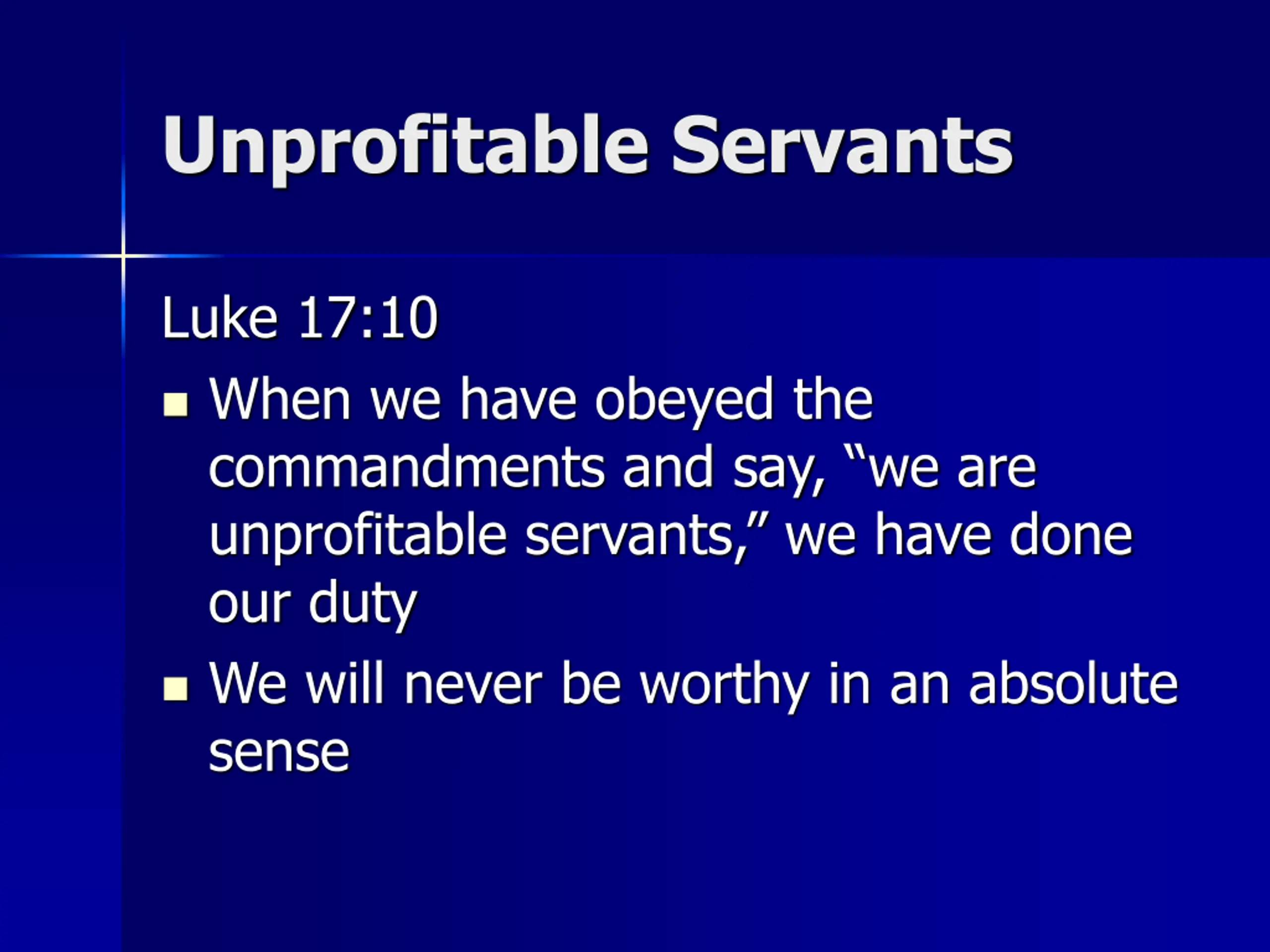 Unprofitable Servants Luke 17:10 When we have obeyed the commandments and say, we are unprofitable servants, we have done our duty We will never be worthy in an absolute sense
