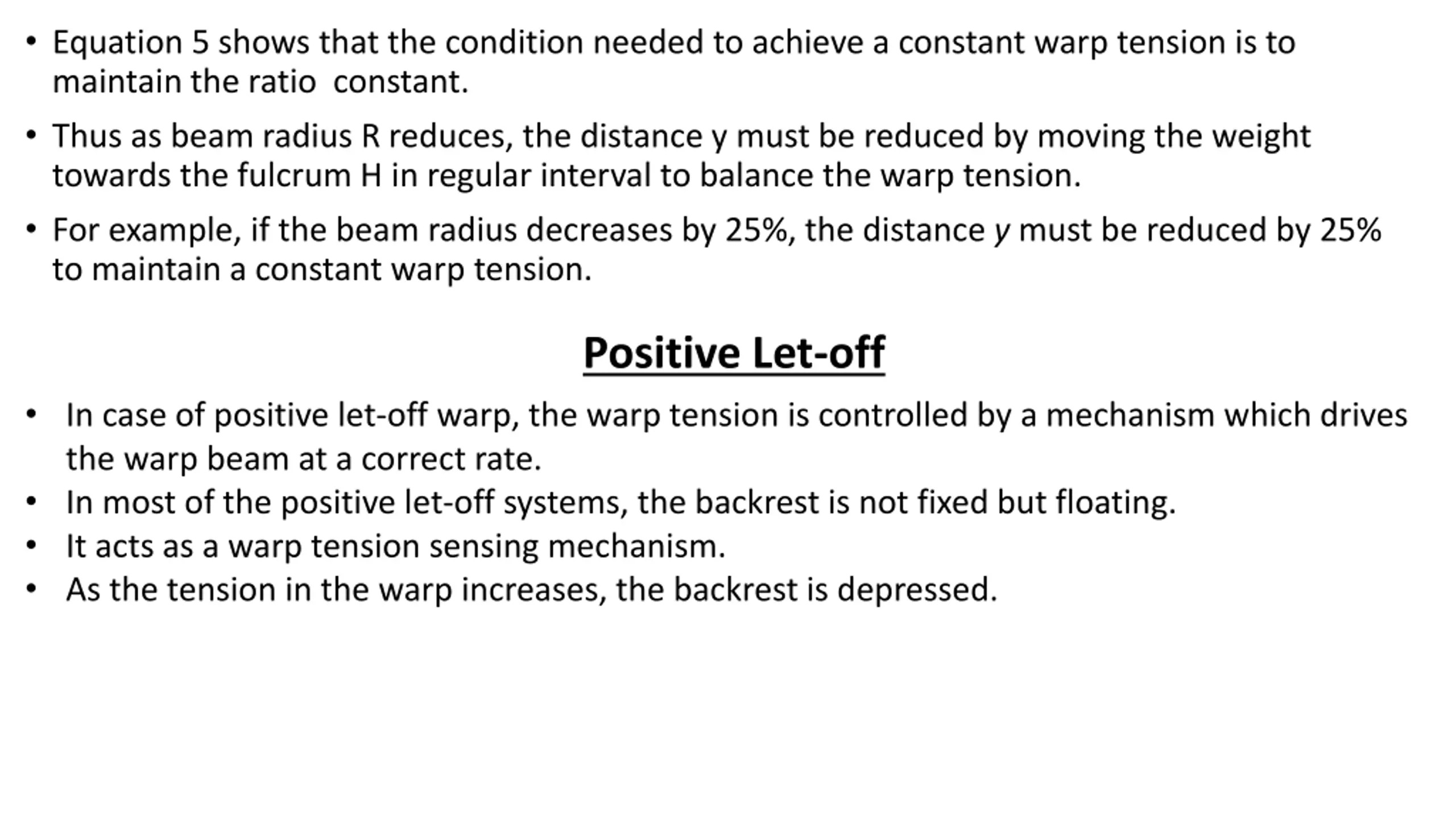 Equation 5 shows that the condition needed to achieve a constant warp tension is to maintain the ratio constant. Thus as beam radius R reduces, the distance y must be reduced by moving the weight towards the fulcrum H in regular interval to balance the warp tension. For example, if the beam radius decreases by 25%, the distance y must be reduced by 25% to maintain a constant warp tension. Positive Let-off In case of positive let-off warp, the warp tension is controlled by a mechanism which drives the warp beam at a correct rate. In most of the positive let-off systems, the backrest is not fixed but floating. It acts as a warp tension sensing mechanism. As the tension in the warp increases, the backrest is depressed.
