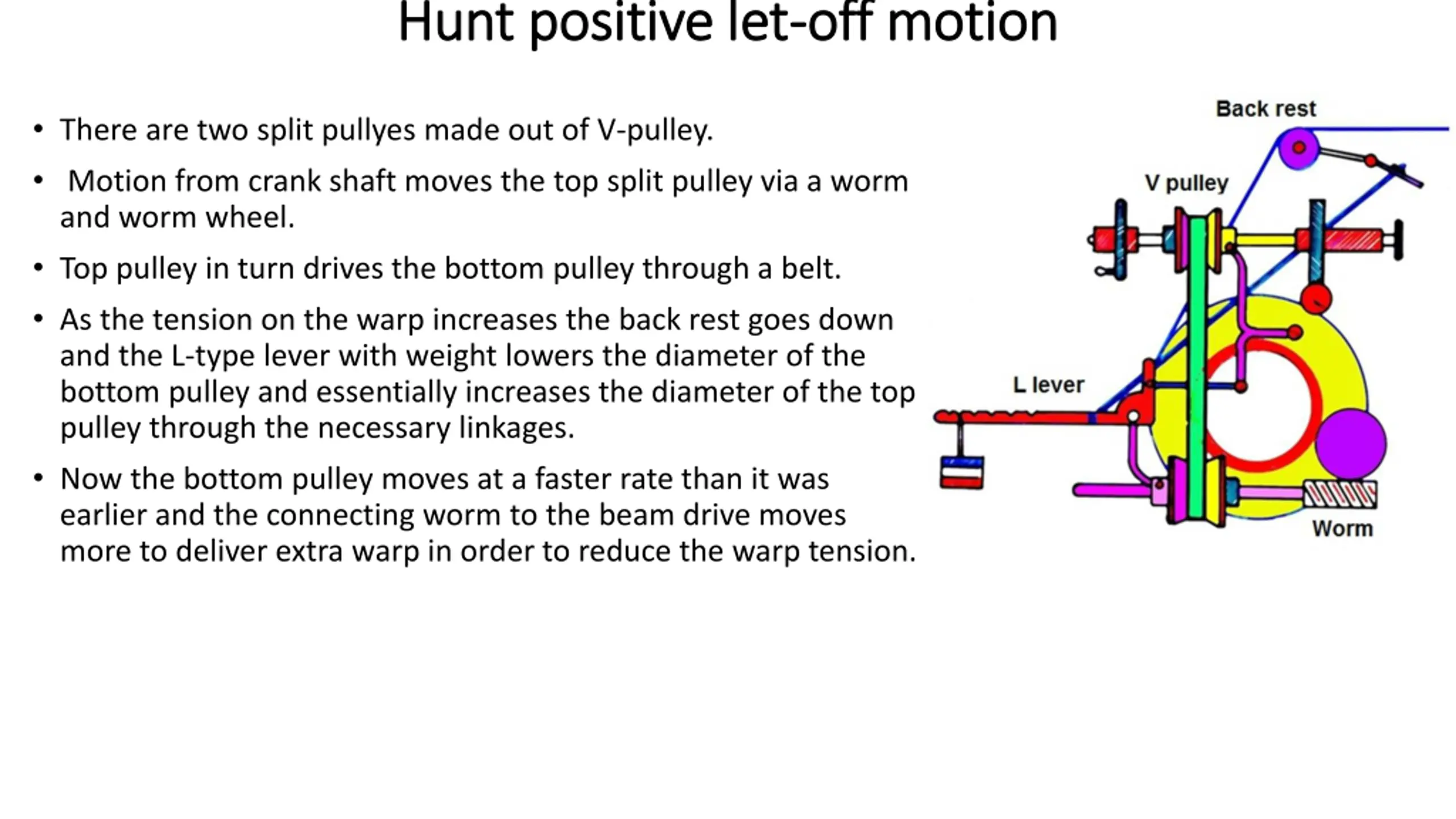 Hunt positive let Hunt positive let- -off motion off motion There are two split pullyes made out of V-pulley. Motion from crank shaft moves the top split pulley via a worm and worm wheel. Top pulley in turn drives the bottom pulley through a belt. As the tension on the warp increases the back rest goes down and the L-type lever with weight lowers the diameter of the bottom pulley and essentially increases the diameter of the top pulley through the necessary linkages. Now the bottom pulley moves at a faster rate than it was earlier and the connecting worm to the beam drive moves more to deliver extra warp in order to reduce the warp tension.