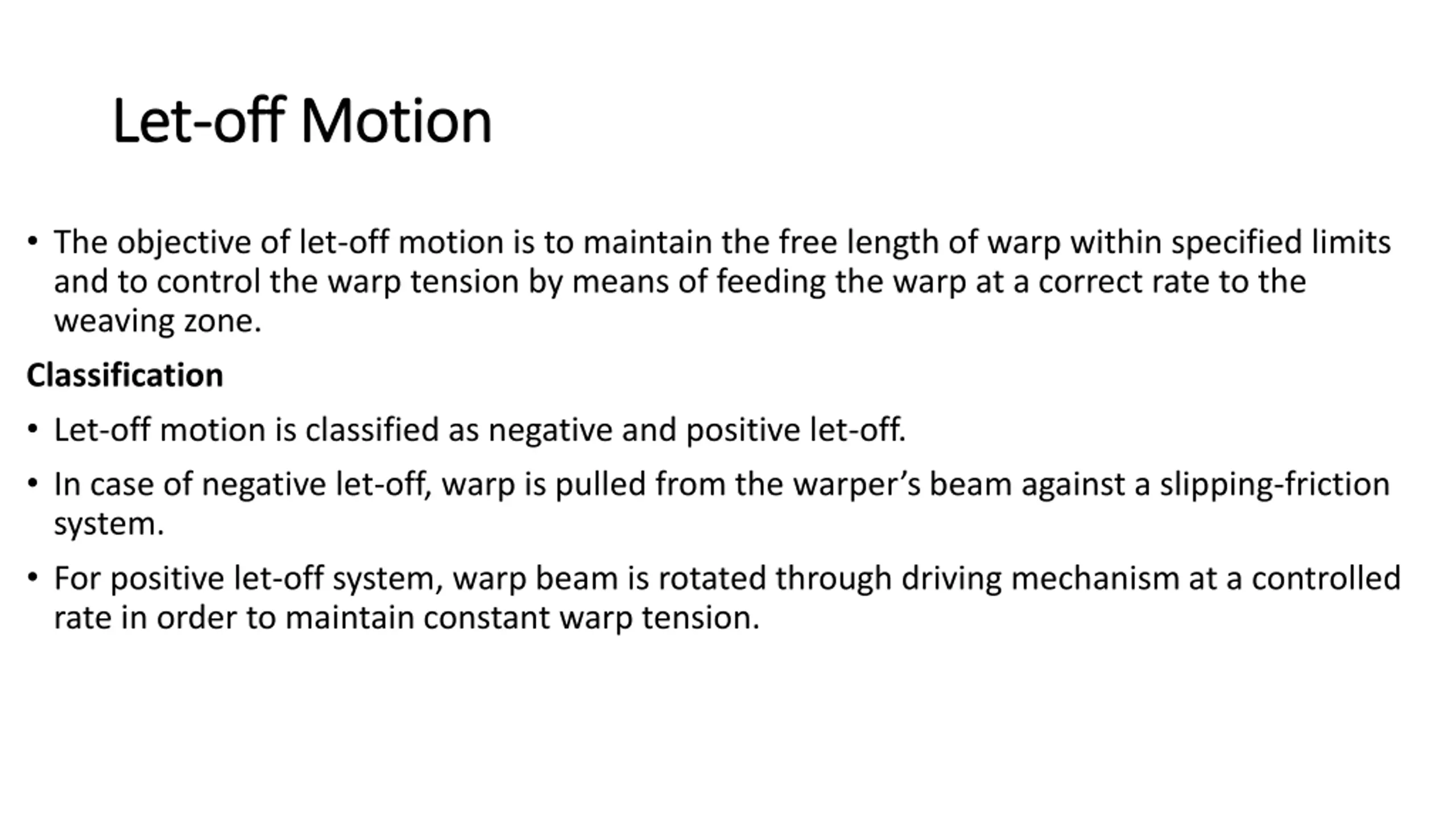 Let Let- -off Motion off Motion The objective of let-off motion is to maintain the free length of warp within specified limits and to control the warp tension by means of feeding the warp at a correct rate to the weaving zone. Classification Let-off motion is classified as negative and positive let-off. In case of negative let-off, warp is pulled from the warper s beam against a slipping-friction system. For positive let-off system, warp beam is rotated through driving mechanism at a controlled rate in order to maintain constant warp tension.