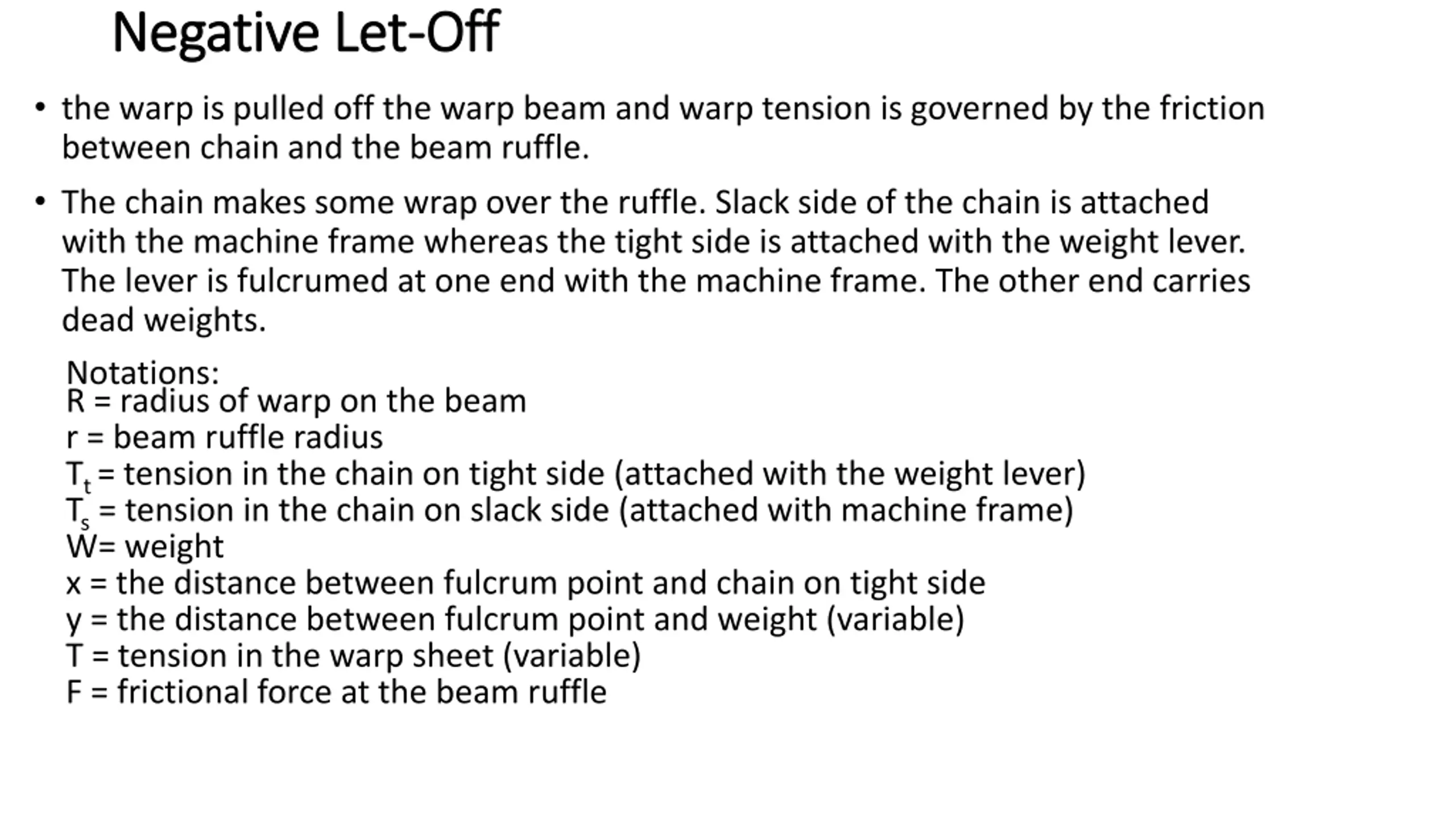 Negative Let Negative Let- -Off Off the warp is pulled off the warp beam and warp tension is governed by the friction between chain and the beam ruffle. The chain makes some wrap over the ruffle. Slack side of the chain is attached with the machine frame whereas the tight side is attached with the weight lever. The lever is fulcrumed at one end with the machine frame. The other end carries dead weights. Notations: R = radius of warp on the beam r = beam ruffle radius Tt= tension in the chain on tight side (attached with the weight lever) Ts= tension in the chain on slack side (attached with machine frame) W= weight x = the distance between fulcrum point and chain on tight side y = the distance between fulcrum point and weight (variable) T = tension in the warp sheet (variable) F = frictional force at the beam ruffle