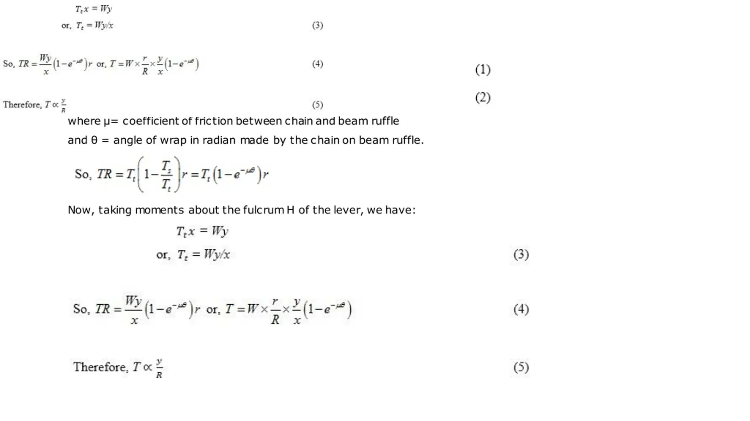 Taking moments about the beam centre we have: T R = F r The frictional force F =Tt - Ts where = coefficient of friction between chain and beam ruffle and = angle of wrap in radian made by the chain on beam ruffle. Now, taking moments about the fulcrum H of the lever, we have:
