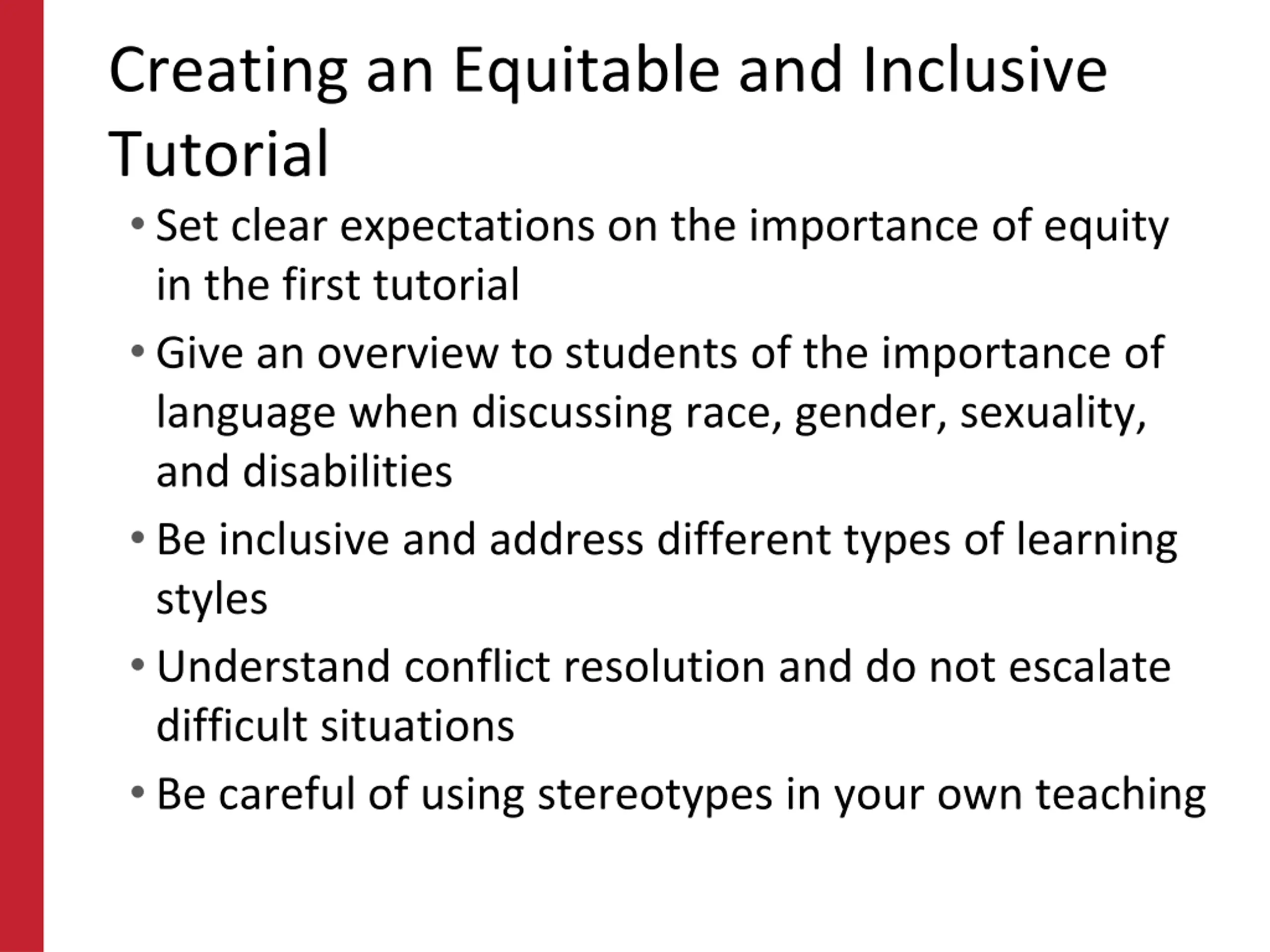 Creating an Equitable and Inclusive Tutorial Set clear expectations on the importance of equity in the first tutorial Give an overview to students of the importance of language when discussing race, gender, sexuality, and disabilities Be inclusive and address different types of learning styles Understand conflict resolution and do not escalate difficult situations Be careful of using stereotypes in your own teaching