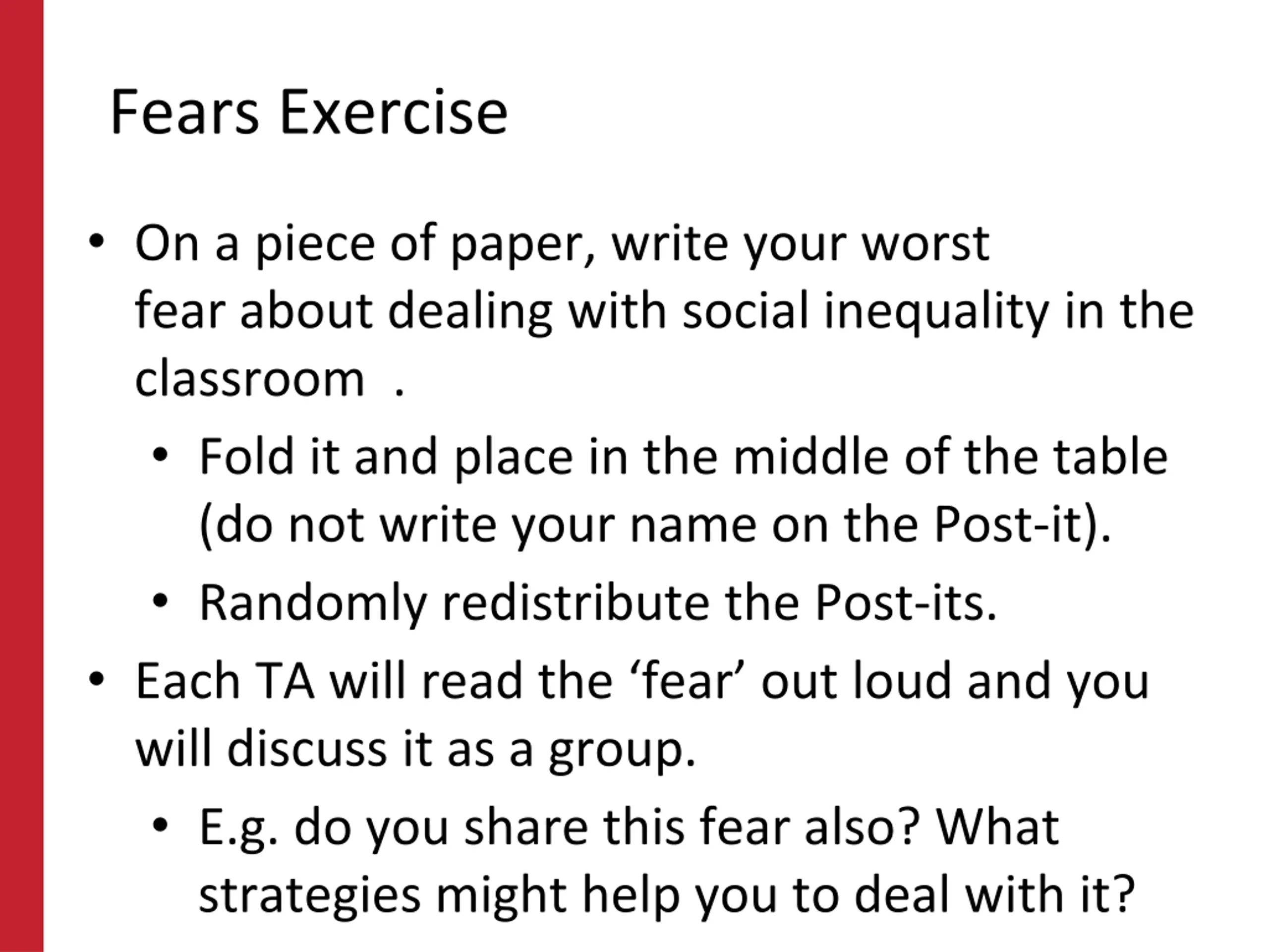 Fears Exercise On a piece of paper, write your worst fear about dealing with social inequality in the classroom . Fold it and place in the middle of the table (do not write your name on the Post-it). Randomly redistribute the Post-its. Each TA will read the fear out loud and you will discuss it as a group. E.g. do you share this fear also? What strategies might help you to deal with it?