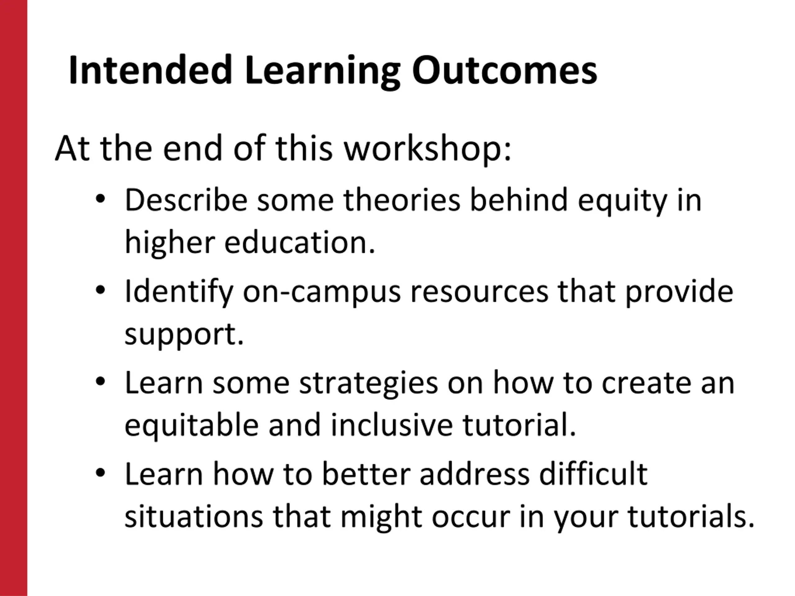 Intended Learning Outcomes At the end of this workshop: Describe some theories behind equity in higher education. Identify on-campus resources that provide support. Learn some strategies on how to create an equitable and inclusive tutorial. Learn how to better address difficult situations that might occur in your tutorials.