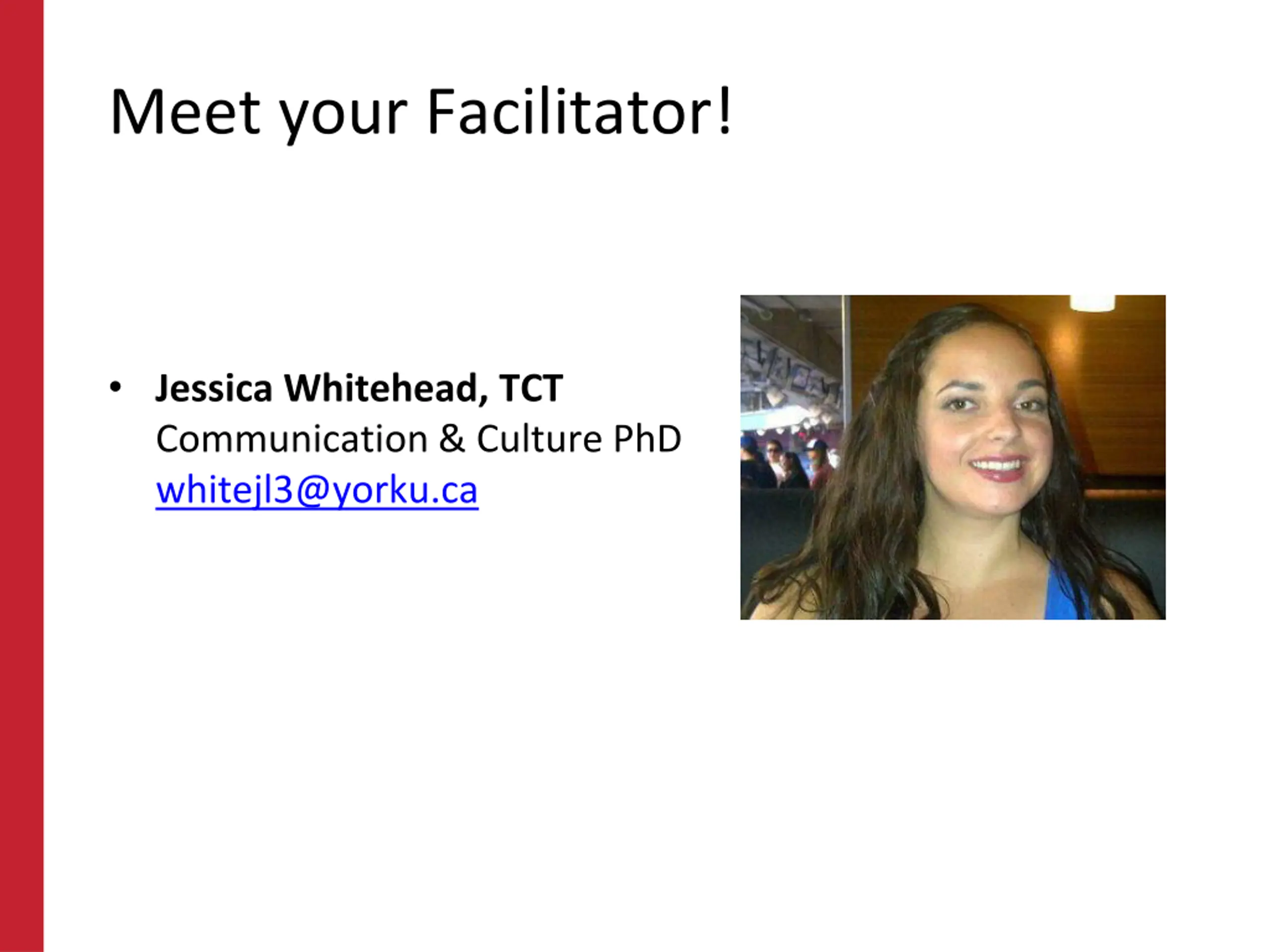 Meet your Facilitator! Jessica Whitehead, TCT Communication & Culture PhD whitejl3@yorku.ca