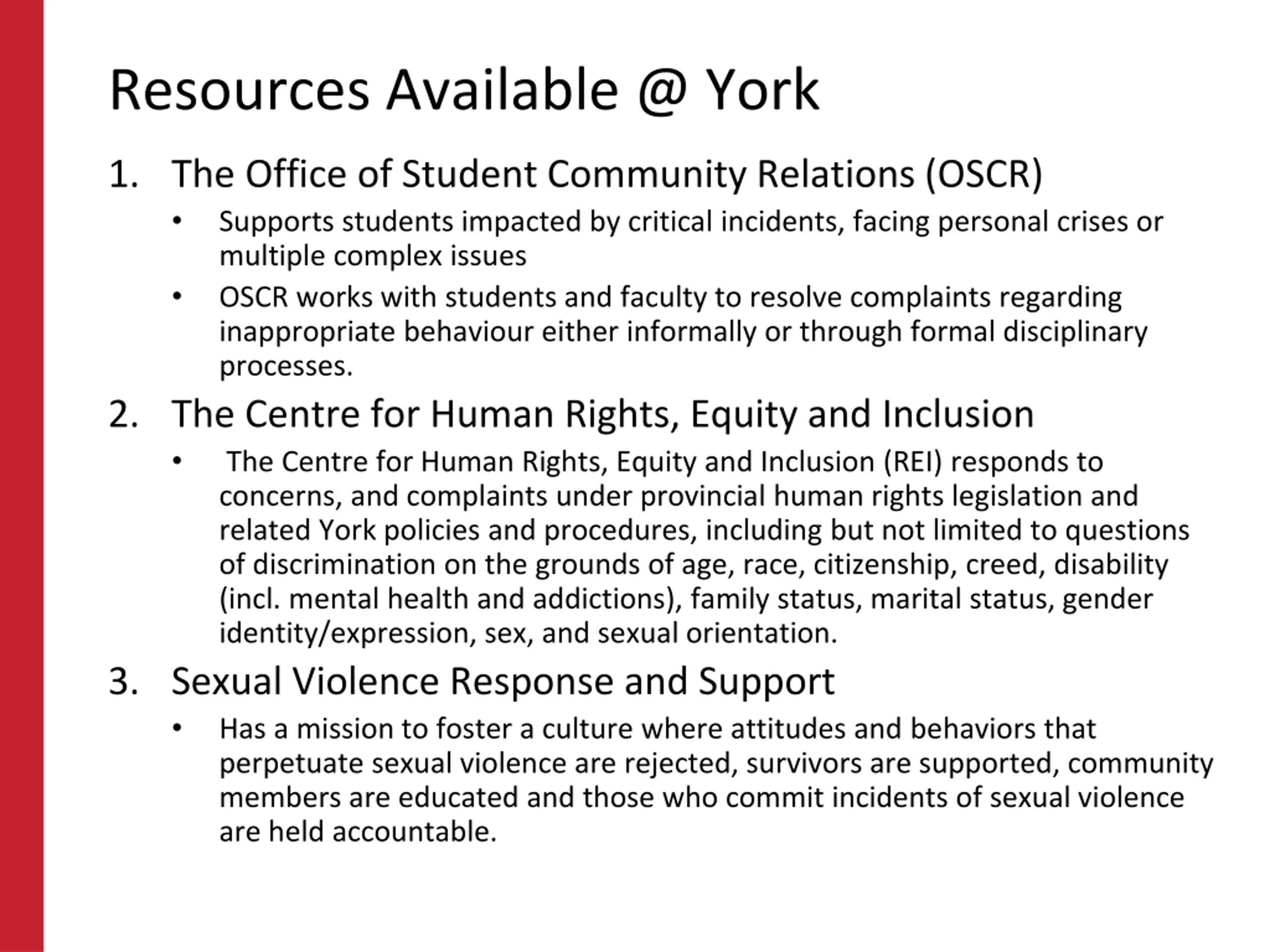 Resources Available @ York 1. The Office of Student Community Relations (OSCR) Supports students impacted by critical incidents, facing personal crises or multiple complex issues OSCR works with students and faculty to resolve complaints regarding inappropriate behaviour either informally or through formal disciplinary processes. 2. The Centre for Human Rights, Equity and Inclusion The Centre for Human Rights, Equity and Inclusion (REI) responds to concerns, and complaints under provincial human rights legislation and related York policies and procedures, including but not limited to questions of discrimination on the grounds of age, race, citizenship, creed, disability (incl. mental health and addictions), family status, marital status, gender identity/expression, sex, and sexual orientation. 3. Sexual Violence Response and Support Has a mission to foster a culture where attitudes and behaviors that perpetuate sexual violence are rejected, survivors are supported, community members are educated and those who commit incidents of sexual violence are held accountable.