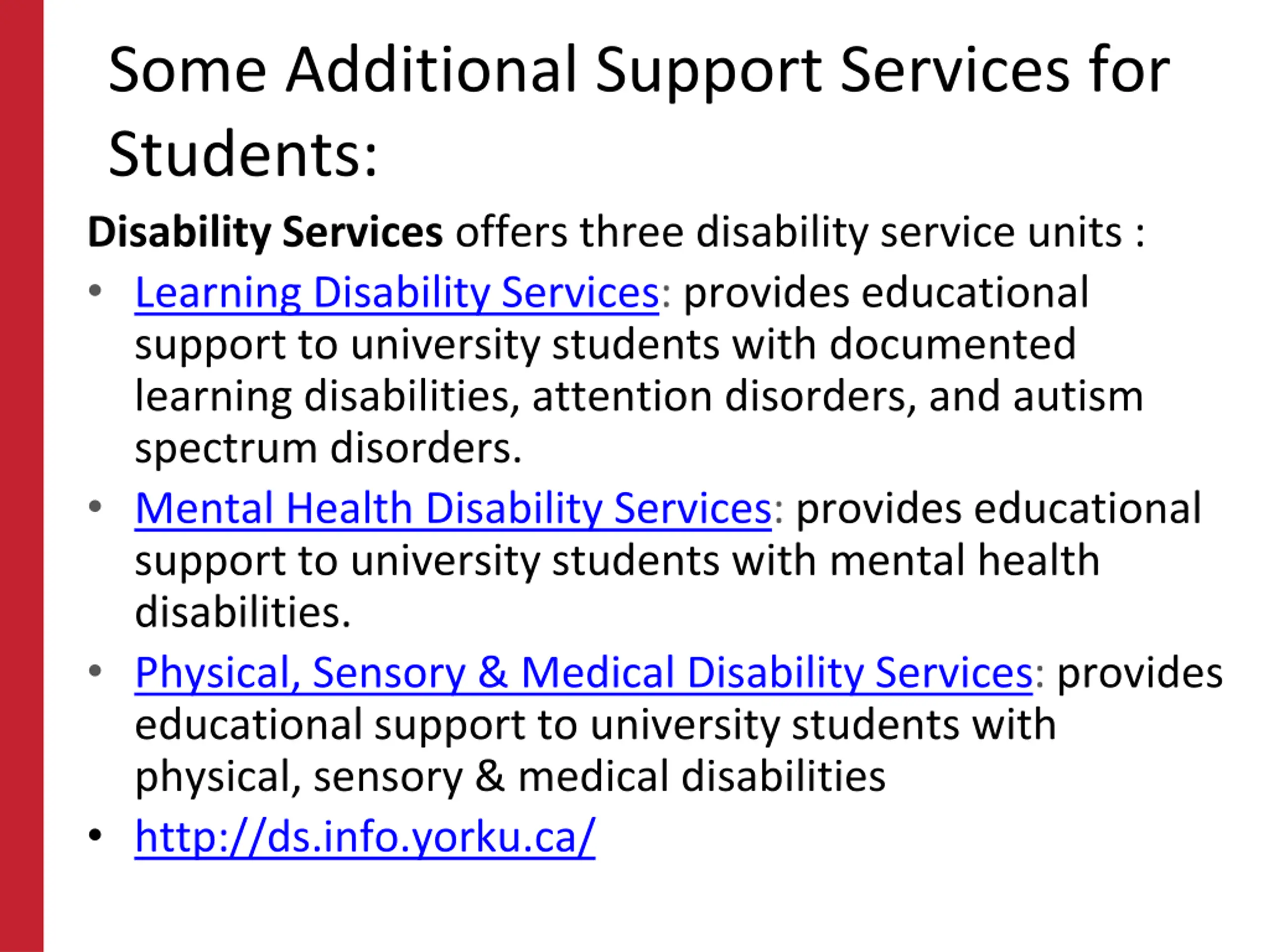 Some Additional Support Services for Students: Disability Services offers three disability service units : Learning Disability Services: provides educational support to university students with documented learning disabilities, attention disorders, and autism spectrum disorders. Mental Health Disability Services: provides educational support to university students with mental health disabilities. Physical, Sensory & Medical Disability Services: provides educational support to university students with physical, sensory & medical disabilities http://ds.info.yorku.ca/