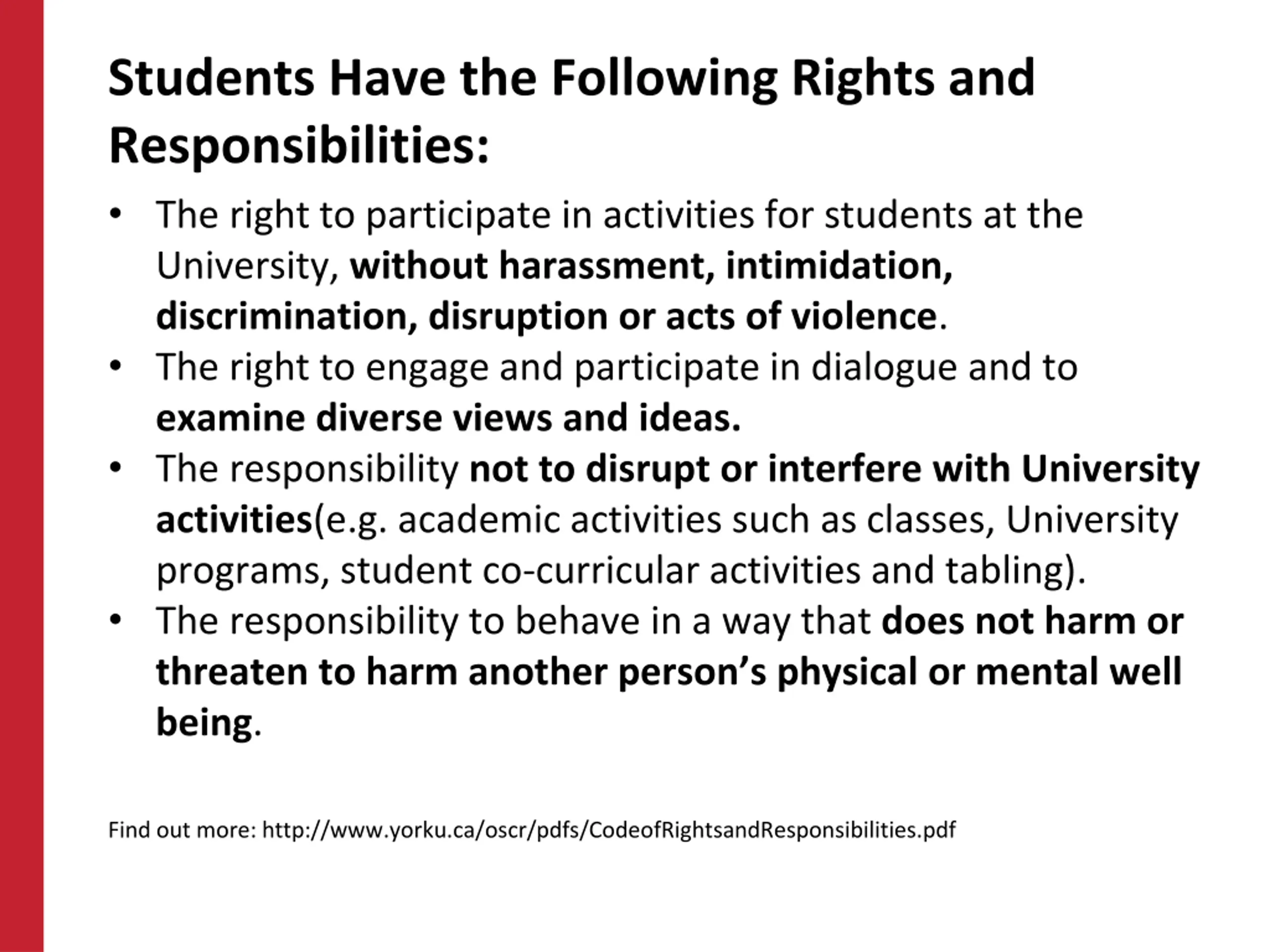 Students Have the Following Rights and Responsibilities: The right to participate in activities for students at the University, without harassment, intimidation, discrimination, disruption or acts of violence. The right to engage and participate in dialogue and to examine diverse views and ideas. The responsibility not to disrupt or interfere with University activities(e.g. academic activities such as classes, University programs, student co-curricular activities and tabling). The responsibility to behave in a way that does not harm or threaten to harm another person s physical or mental well being. Find out more: http://www.yorku.ca/oscr/pdfs/CodeofRightsandResponsibilities.pdf