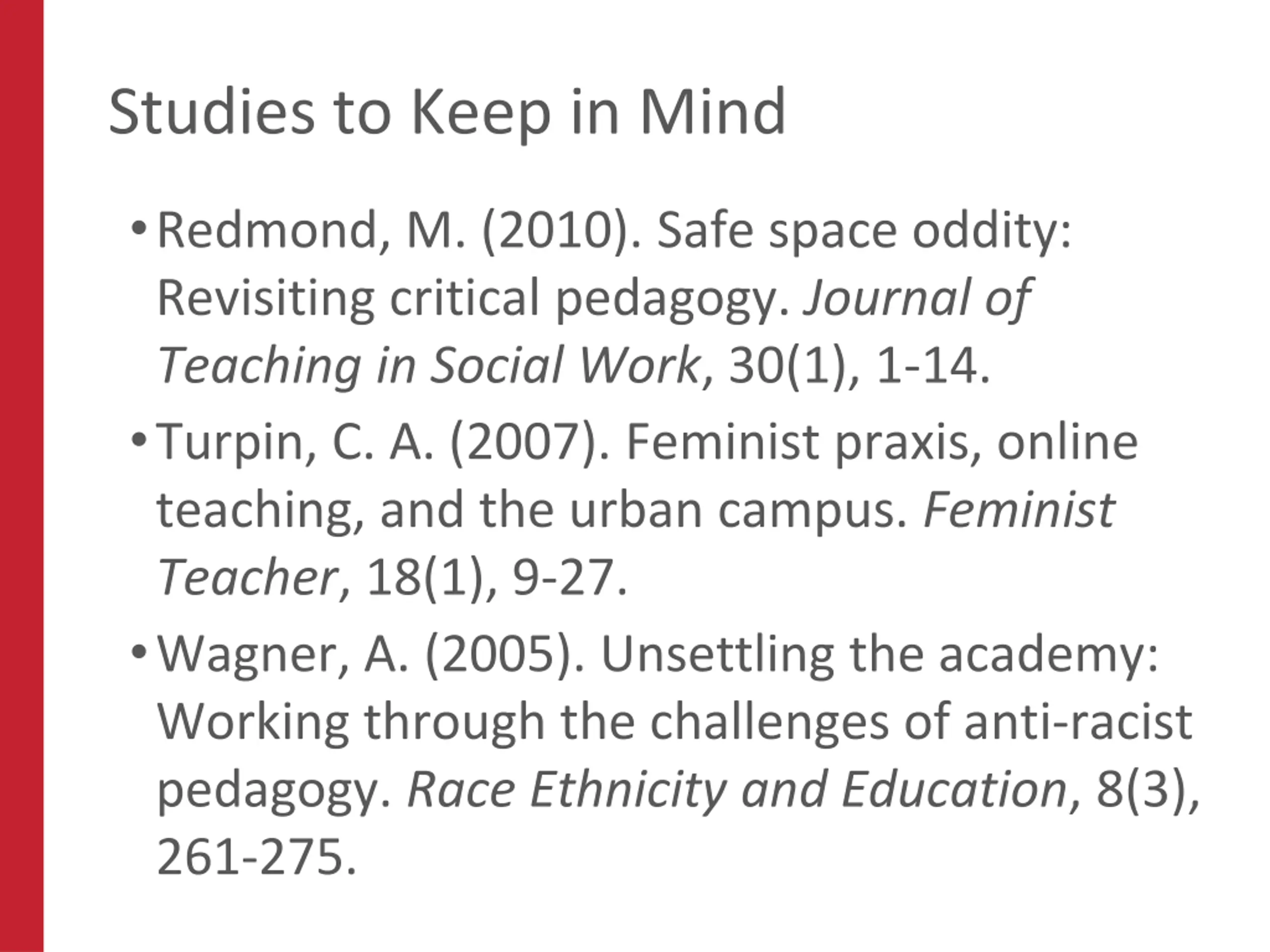 Studies to Keep in Mind Redmond, M. (2010). Safe space oddity: Revisiting critical pedagogy. Journal of Teaching in Social Work, 30(1), 1-14. Turpin, C. A. (2007). Feminist praxis, online teaching, and the urban campus. Feminist Teacher, 18(1), 9-27. Wagner, A. (2005). Unsettling the academy: Working through the challenges of anti racist pedagogy. Race Ethnicity and Education, 8(3), 261-275.