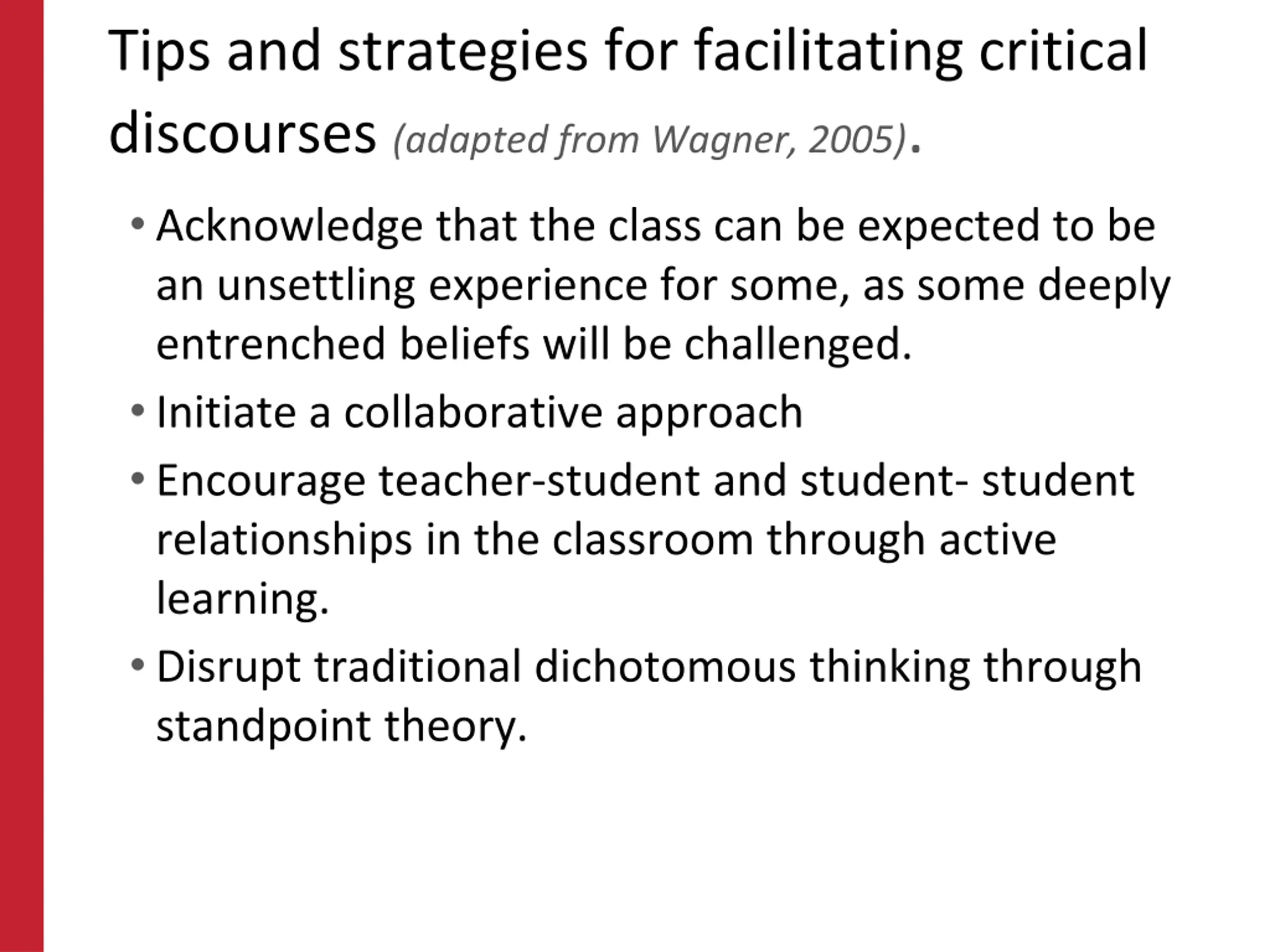 Tips and strategies for facilitating critical discourses (adapted from Wagner, 2005). Acknowledge that the class can be expected to be an unsettling experience for some, as some deeply entrenched beliefs will be challenged. Initiate a collaborative approach Encourage teacher-student and student- student relationships in the classroom through active learning. Disrupt traditional dichotomous thinking through standpoint theory.