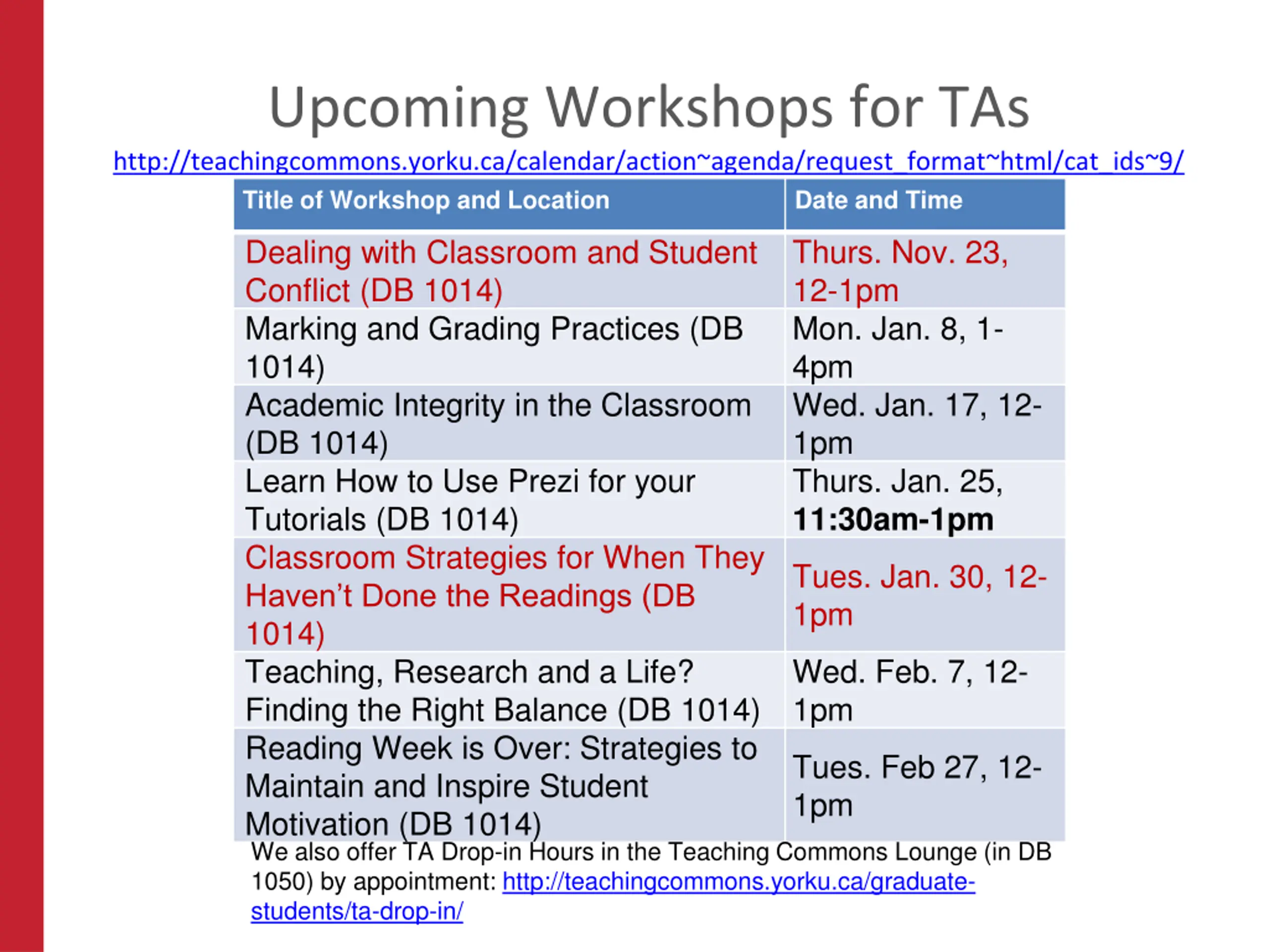 Upcoming Workshops for TAs http://teachingcommons.yorku.ca/calendar/action~agenda/request_format~html/cat_ids~9/ Title of Workshop and Location Date and Time Dealing with Classroom and Student Conflict (DB 1014) Marking and Grading Practices (DB 1014) Academic Integrity in the Classroom (DB 1014) Learn How to Use Prezi for your Tutorials (DB 1014) Classroom Strategies for When They Haven t Done the Readings (DB 1014) Teaching, Research and a Life? Finding the Right Balance (DB 1014) Reading Week is Over: Strategies to Maintain and Inspire Student Motivation (DB 1014) We also offer TA Drop-in Hours in the Teaching Commons Lounge (in DB 1050) by appointment: http://teachingcommons.yorku.ca/graduate- students/ta-drop-in/ Thurs. Nov. 23, 12-1pm Mon. Jan. 8, 1- 4pm Wed. Jan. 17, 12- 1pm Thurs. Jan. 25, 11:30am-1pm Tues. Jan. 30, 12- 1pm Wed. Feb. 7, 12- 1pm Tues. Feb 27, 12- 1pm