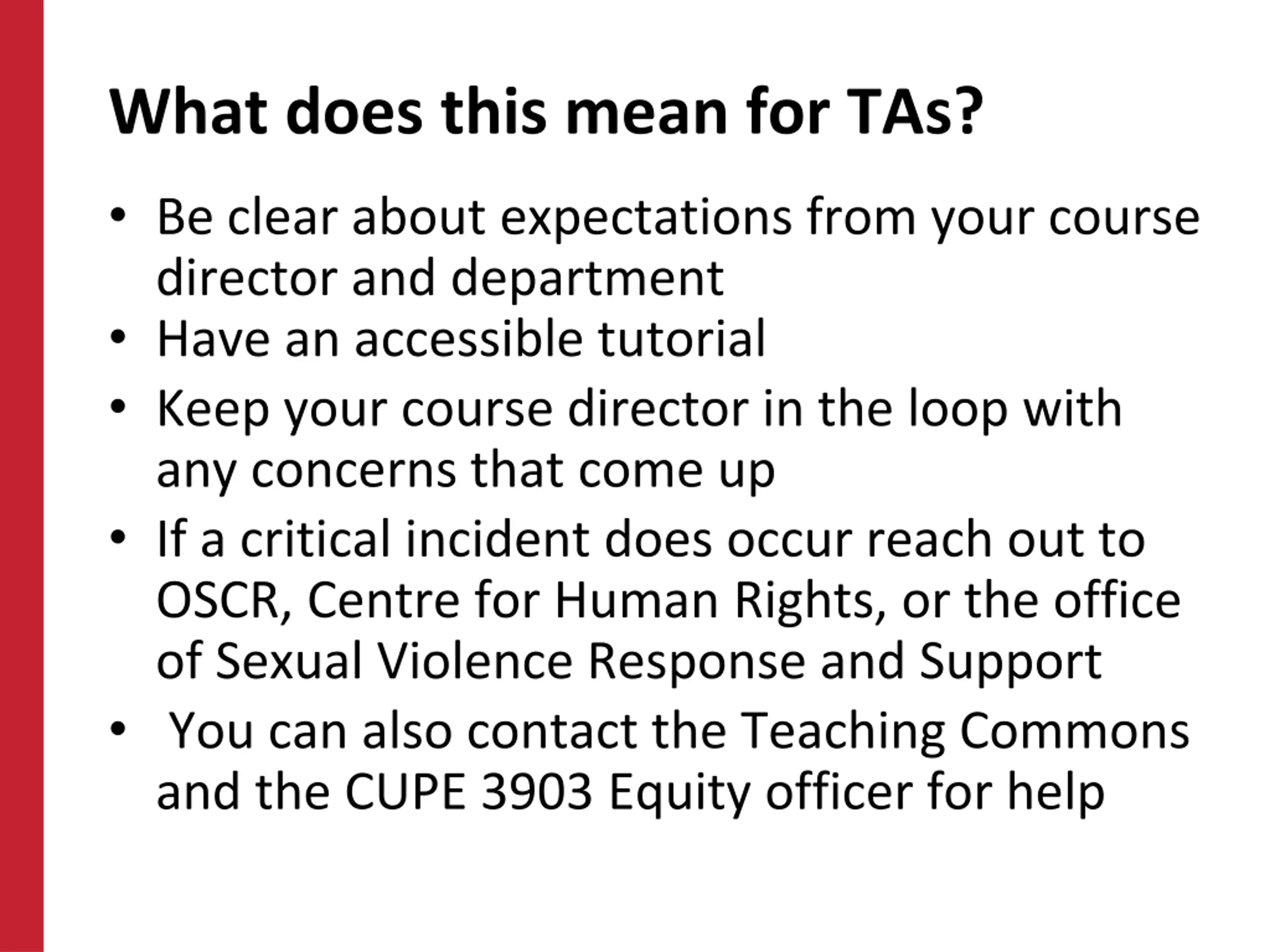 What does this mean for TAs? Be clear about expectations from your course director and department Have an accessible tutorial Keep your course director in the loop with any concerns that come up If a critical incident does occur reach out to OSCR, Centre for Human Rights, or the office of Sexual Violence Response and Support You can also contact the Teaching Commons and the CUPE 3903 Equity officer for help
