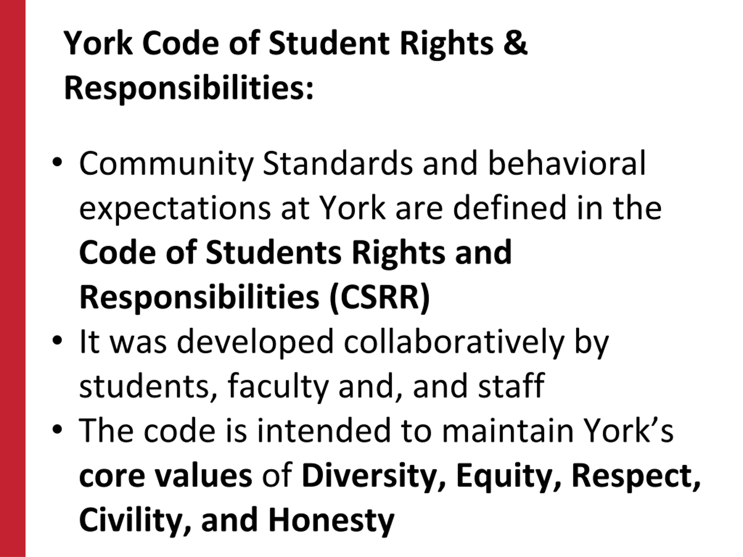 York Code of Student Rights & Responsibilities: Community Standards and behavioral expectations at York are defined in the Code of Students Rights and Responsibilities (CSRR) It was developed collaboratively by students, faculty and, and staff The code is intended to maintain York s core values of Diversity, Equity, Respect, Civility, and Honesty