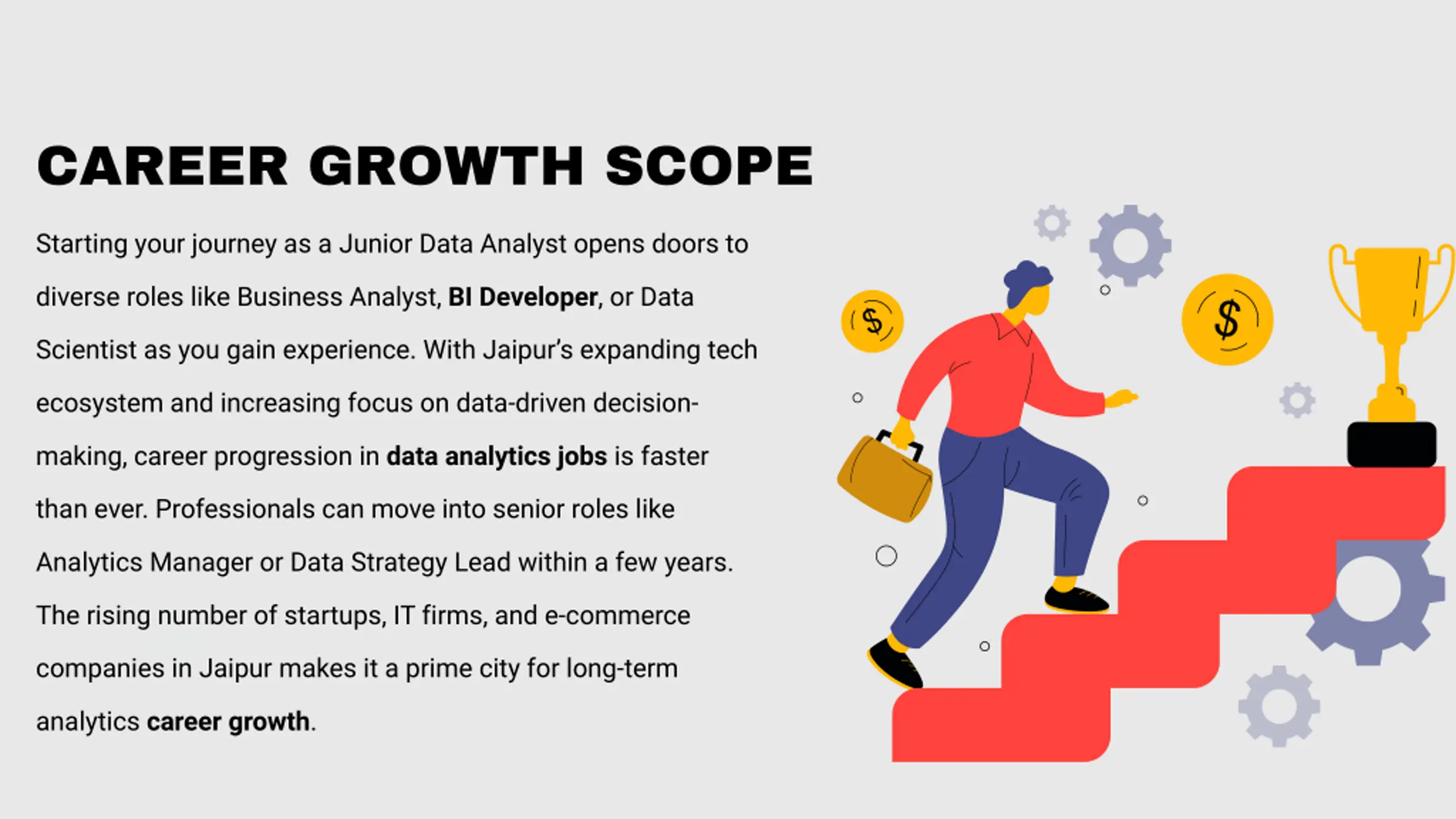 CAREER GROWTH SCOPE Starting your journey as a Junior Data Analyst opens doors to diverse roles like Business Analyst, BI Developer, or Data Scientist as you gain experience. With Jaipur s expanding tech ecosystem and increasing focus on data-driven decision- making, career progression in data analytics jobs is faster than ever. Professionals can move into senior roles like Analytics Manager or Data Strategy Lead within a few years. The rising number of startups, IT firms, and e-commerce companies in Jaipur makes it a prime city for long-term analytics career growth.