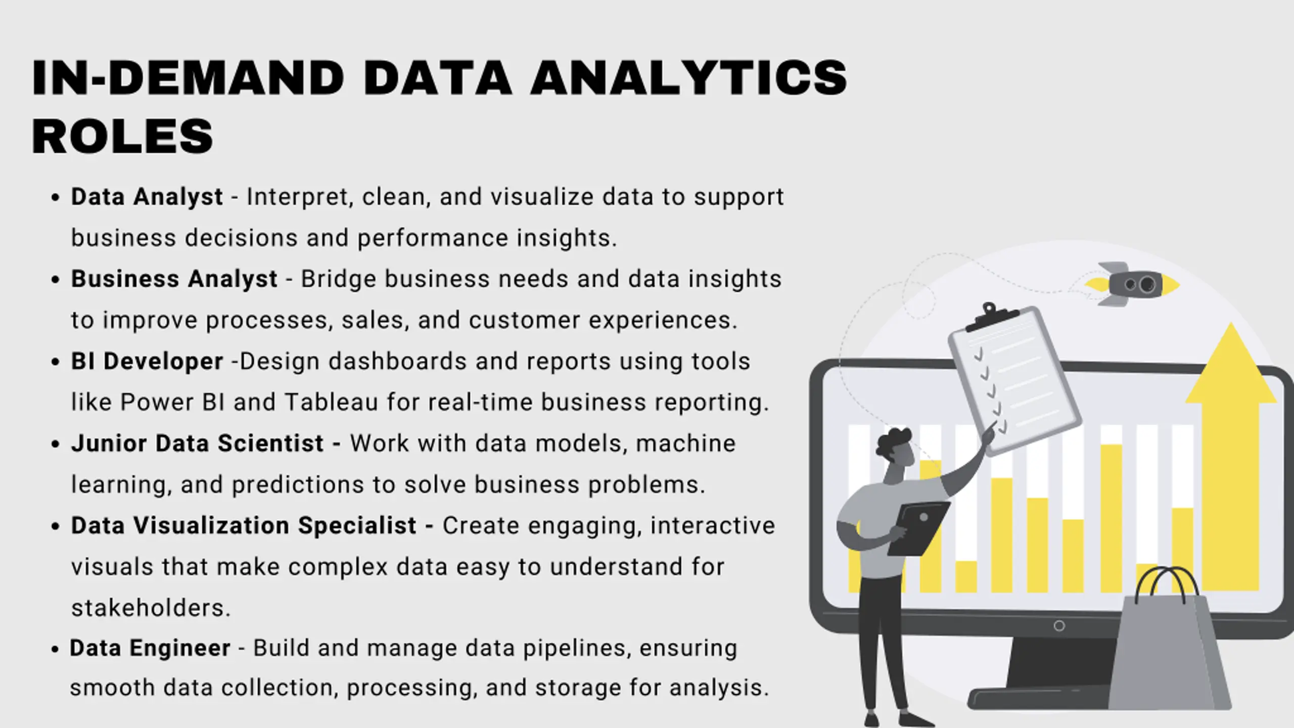 IN-DEMAND DATA ANALYTICS ROLES Data Analyst - Interpret, clean, and visualize data to support business decisions and performance insights. Business Analyst - Bridge business needs and data insights to improve processes, sales, and customer experiences. BI Developer -Design dashboards and reports using tools like Power BI and Tableau for real-time business reporting. Junior Data Scientist - Work with data models, machine learning, and predictions to solve business problems. Data Visualization Specialist - Create engaging, interactive visuals that make complex data easy to understand for stakeholders. Data Engineer - Build and manage data pipelines, ensuring smooth data collection, processing, and storage for analysis.
