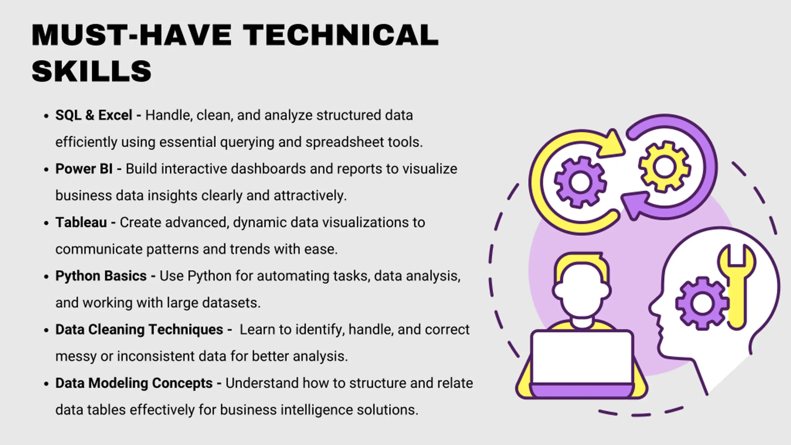 MUST-HAVE TECHNICAL SKILLS SQL & Excel - Handle, clean, and analyze structured data efficiently using essential querying and spreadsheet tools. Power BI - Build interactive dashboards and reports to visualize business data insights clearly and attractively. Tableau - Create advanced, dynamic data visualizations to communicate patterns and trends with ease. Python Basics - Use Python for automating tasks, data analysis, and working with large datasets. Data Cleaning Techniques - Learn to identify, handle, and correct messy or inconsistent data for better analysis. Data Modeling Concepts - Understand how to structure and relate data tables effectively for business intelligence solutions.
