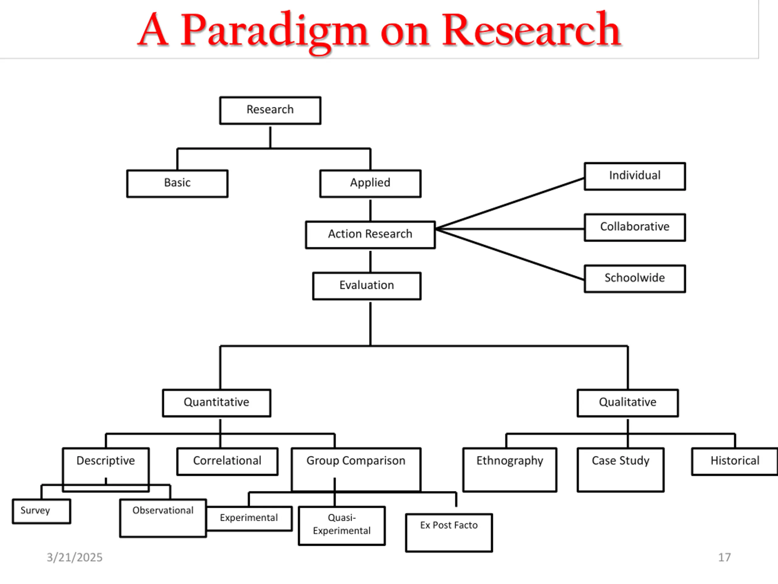 A Paradigm on Research Research Individual Basic Applied Collaborative Action Research Schoolwide Evaluation Quantitative Qualitative Descriptive Correlational Group Comparison Ethnography Case Study Historical Survey Observational Experimental Quasi- Ex Post Facto Experimental 3/21/2025 17