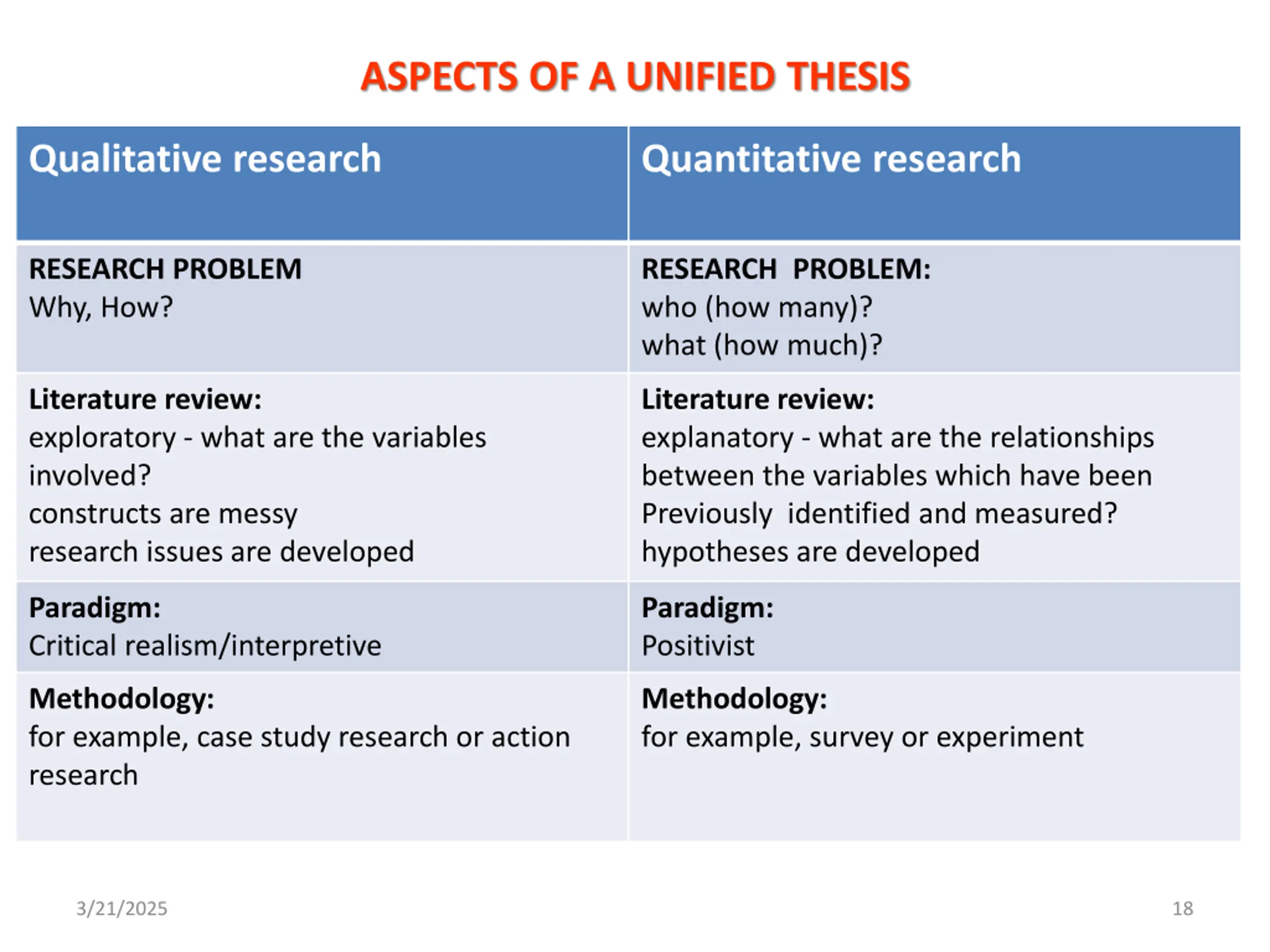 ASPECTS OF A UNIFIED THESIS Qualitative research Quantitative research RESEARCH PROBLEM Why, How? RESEARCH PROBLEM: who (how many)? what (how much)? Literature review: exploratory - what are the variables involved? constructs are messy research issues are developed Literature review: explanatory - what are the relationships between the variables which have been Previously identified and measured? hypotheses are developed Paradigm: Critical realism/interpretive Paradigm: Positivist Methodology: for example, case study research or action research Methodology: for example, survey or experiment 3/21/2025 18