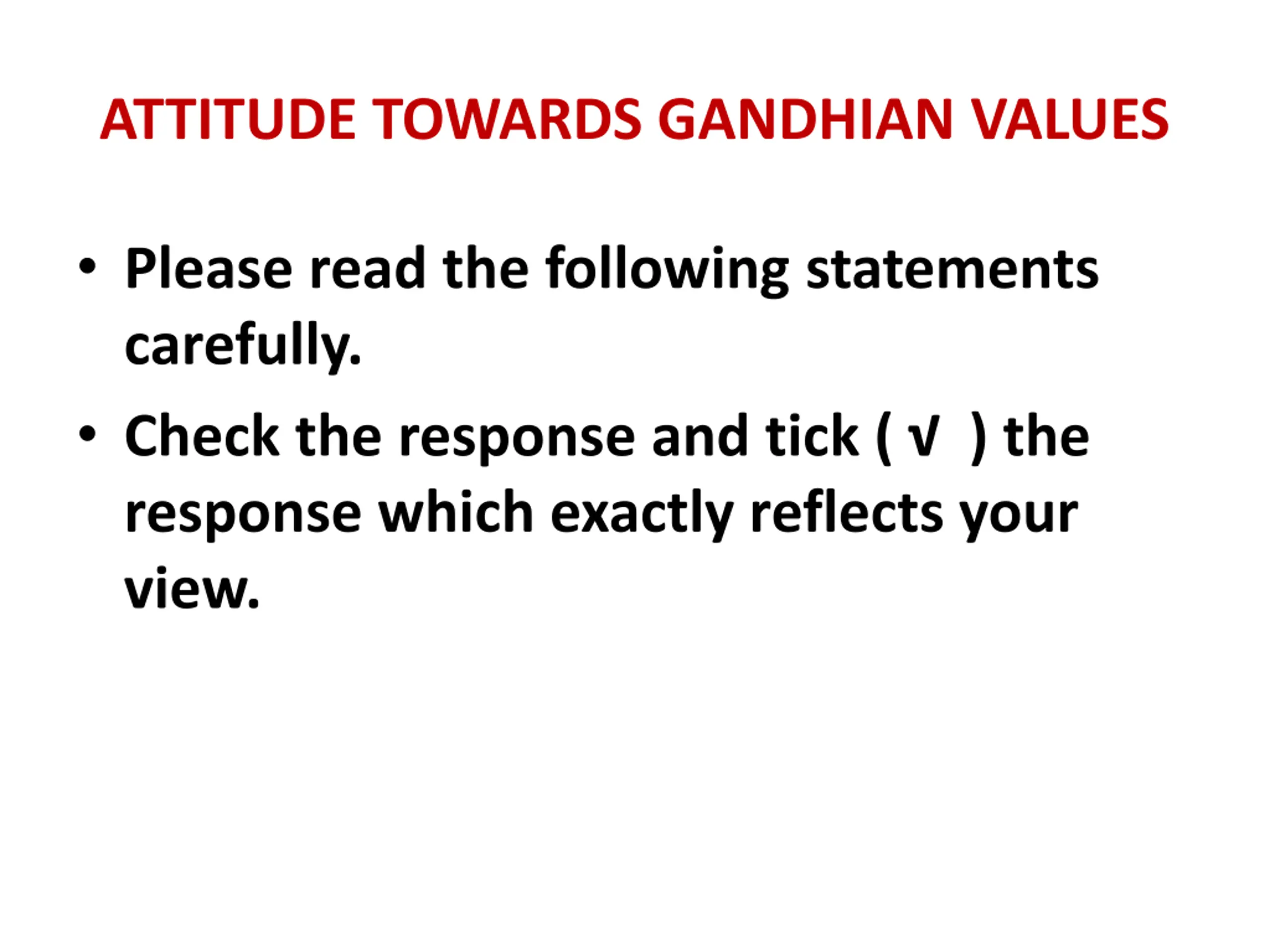 ATTITUDE TOWARDS GANDHIAN VALUES Please read the following statements carefully. Check the response and tick ( ) the response which exactly reflects your view.