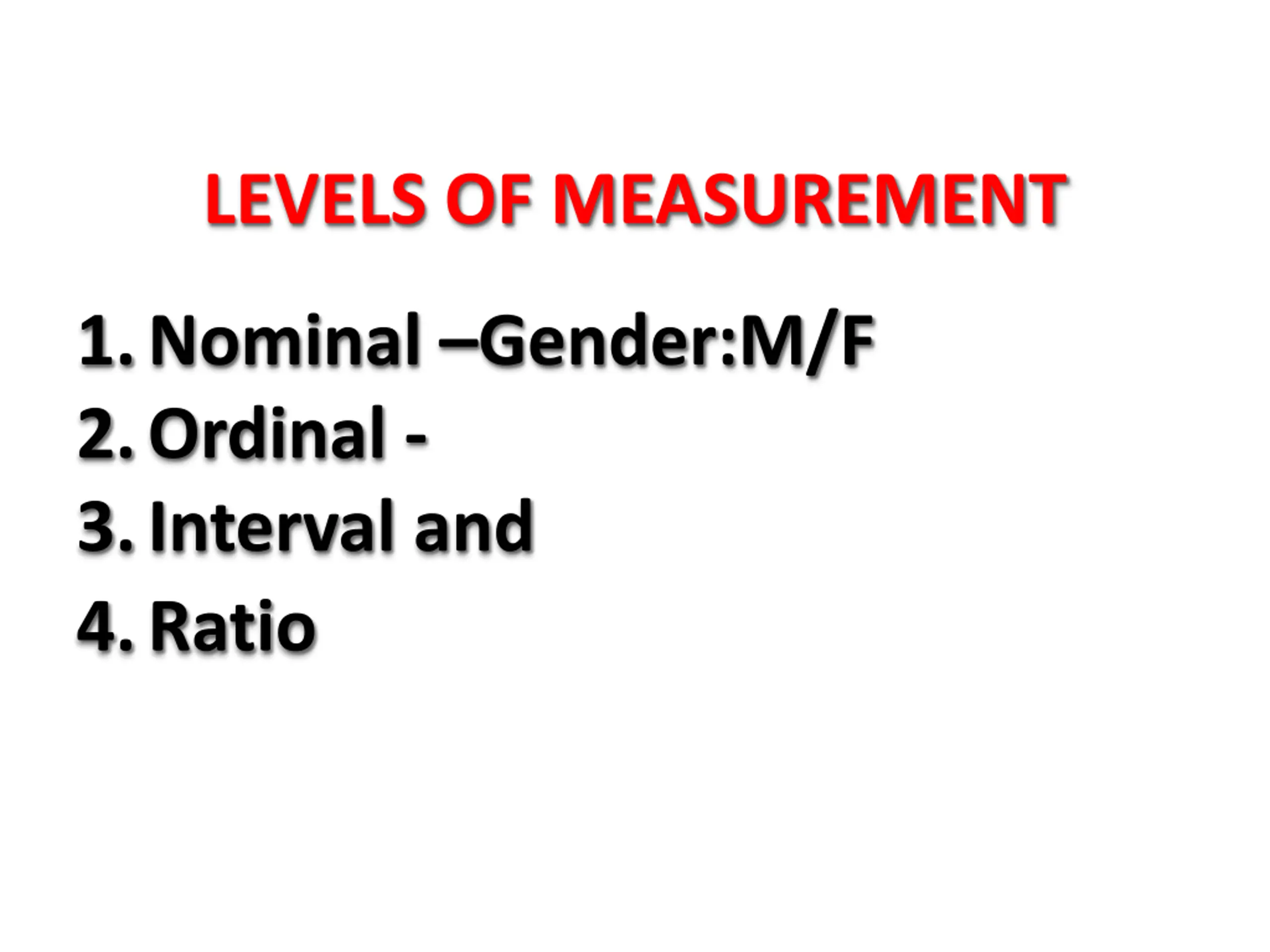 LEVELS OF MEASUREMENT 1.Nominal Gender:M/F 2.Ordinal - 3.Interval and 4.Ratio