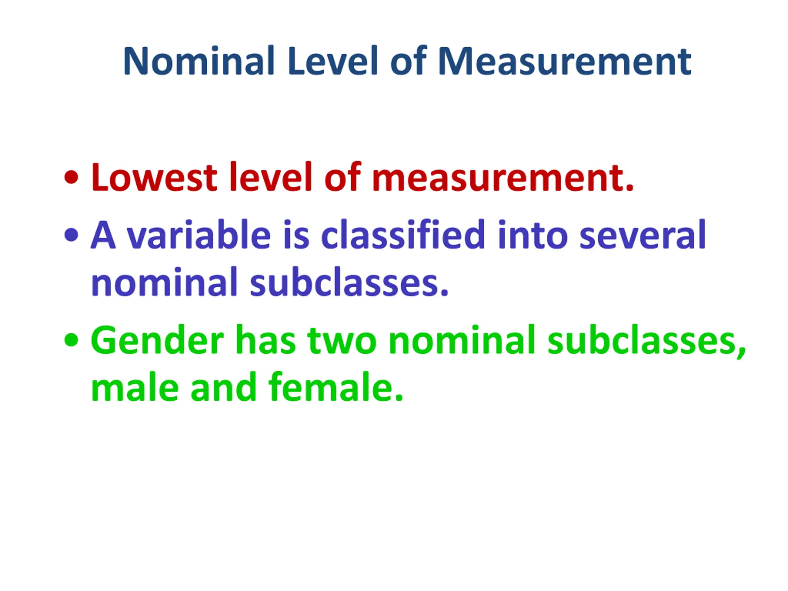 Nominal Level of Measurement Lowest level of measurement. A variable is classified into several nominal subclasses. Gender has two nominal subclasses, male and female.