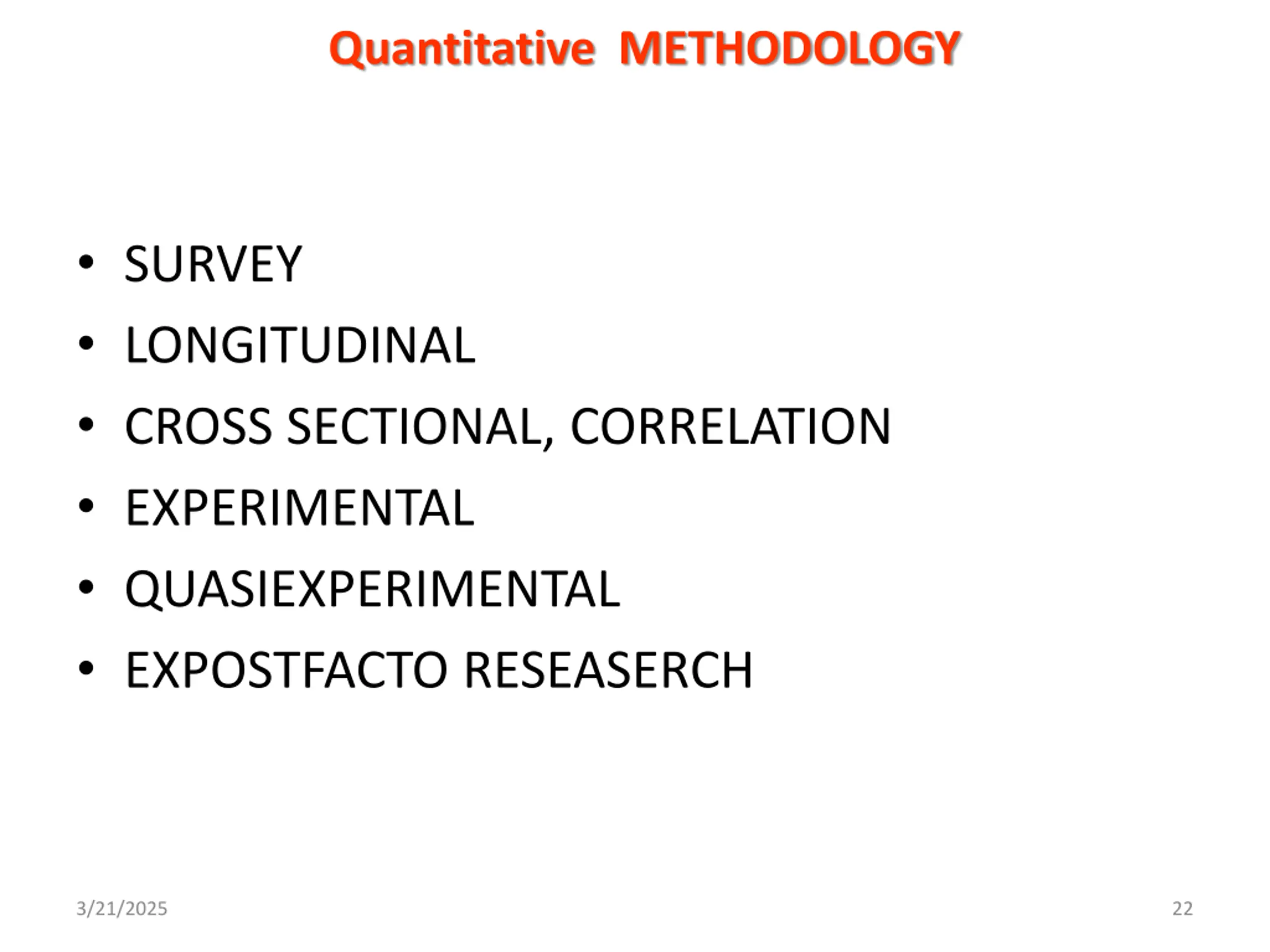 Quantitative METHODOLOGY SURVEY LONGITUDINAL CROSS SECTIONAL, CORRELATION EXPERIMENTAL QUASIEXPERIMENTAL EXPOSTFACTO RESEASERCH 3/21/2025 22