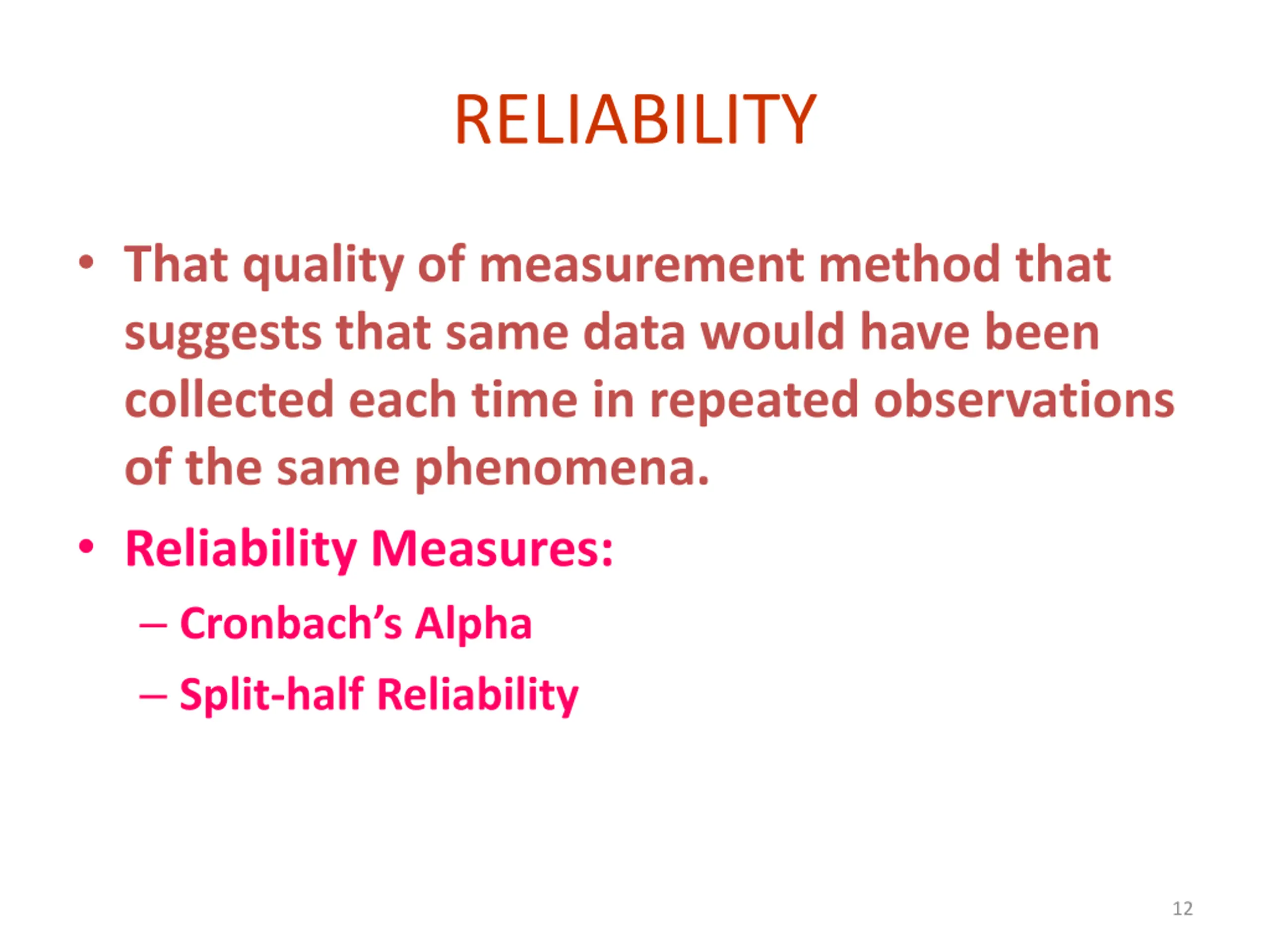 RELIABILITY That quality of measurement method that suggests that same data would have been collected each time in repeated observations of the same phenomena. Reliability Measures: Cronbach s Alpha Split-half Reliability 12