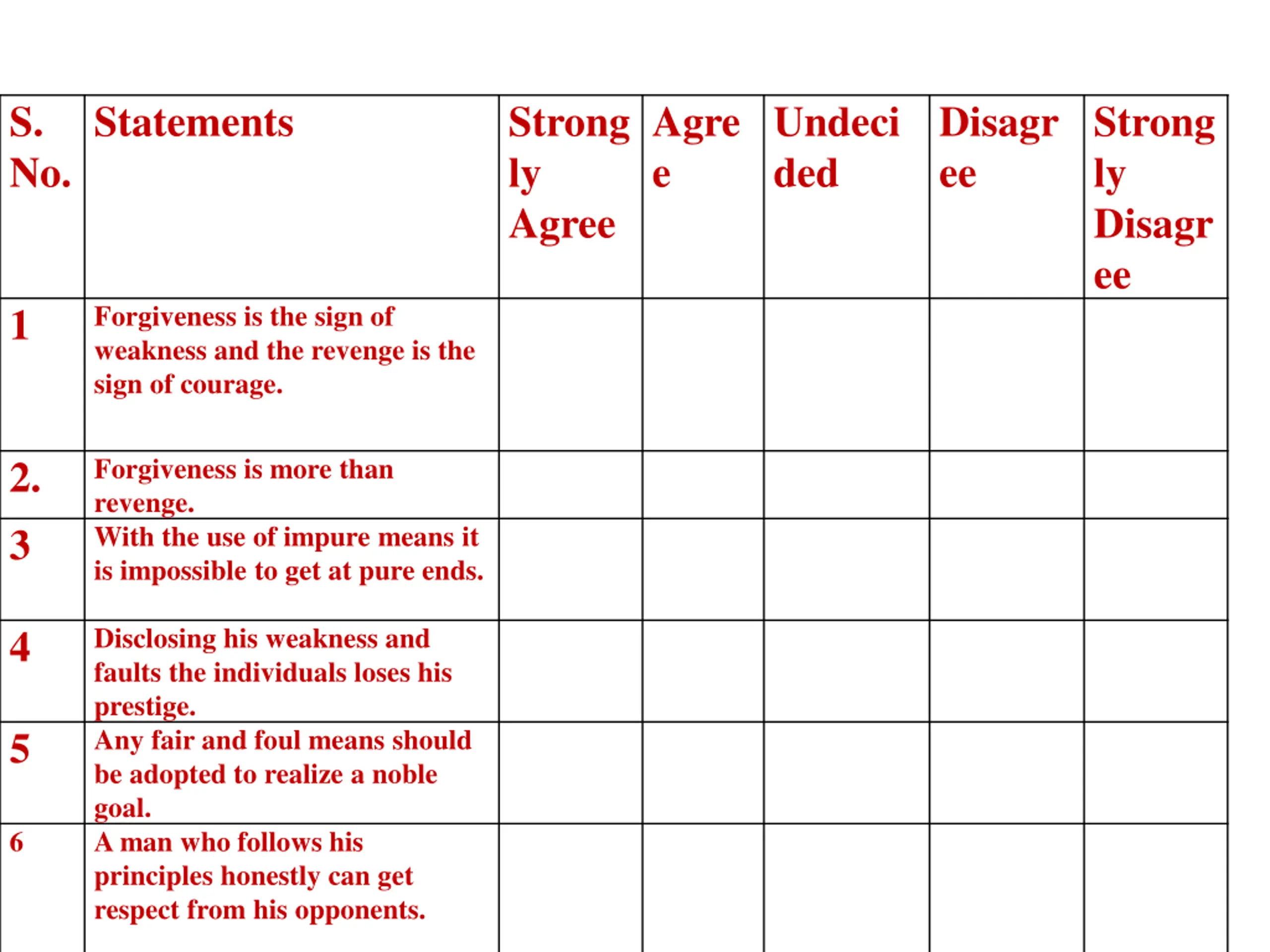 S. No. Statements Strong ly Agree Agre e Undeci ded Disagr ee Strong ly Disagr ee Forgiveness is the sign of weakness and the revenge is the sign of courage. 1 Forgiveness is more than revenge. With the use of impure means it is impossible to get at pure ends. 2. 3 Disclosing his weakness and faults the individuals loses his prestige. Any fair and foul means should be adopted to realize a noble goal. A man who follows his principles honestly can get respect from his opponents. 4 5 6