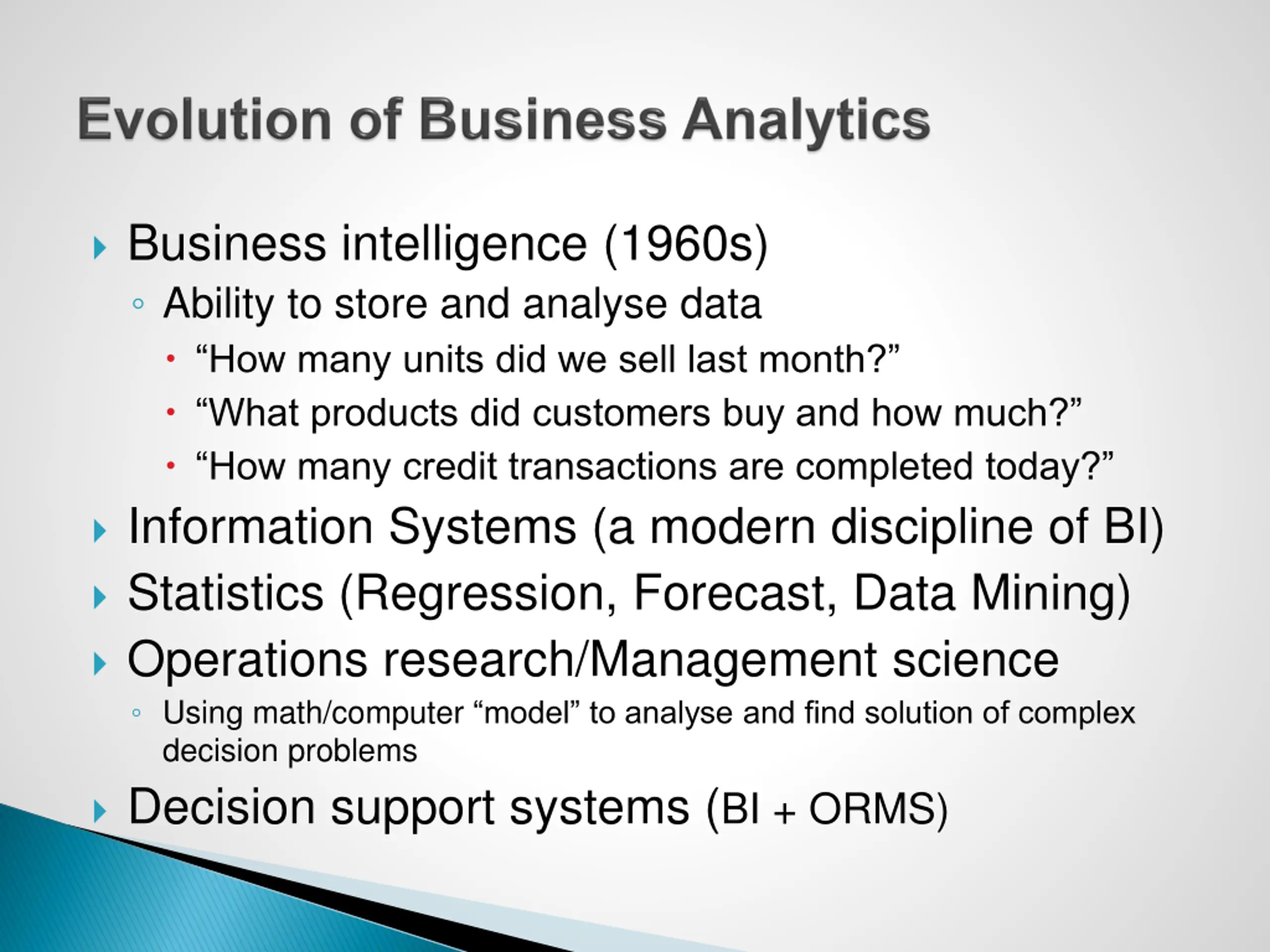 Business intelligence (1960s) Ability to store and analyse data How many units did we sell last month? What products did customers buy and how much? How many credit transactions are completed today? Information Systems (a modern discipline of BI) Statistics (Regression, Forecast, Data Mining) Operations research/Management science Using math/computer model to analyse and find solution of complex decision problems Decision support systems (BI + ORMS)