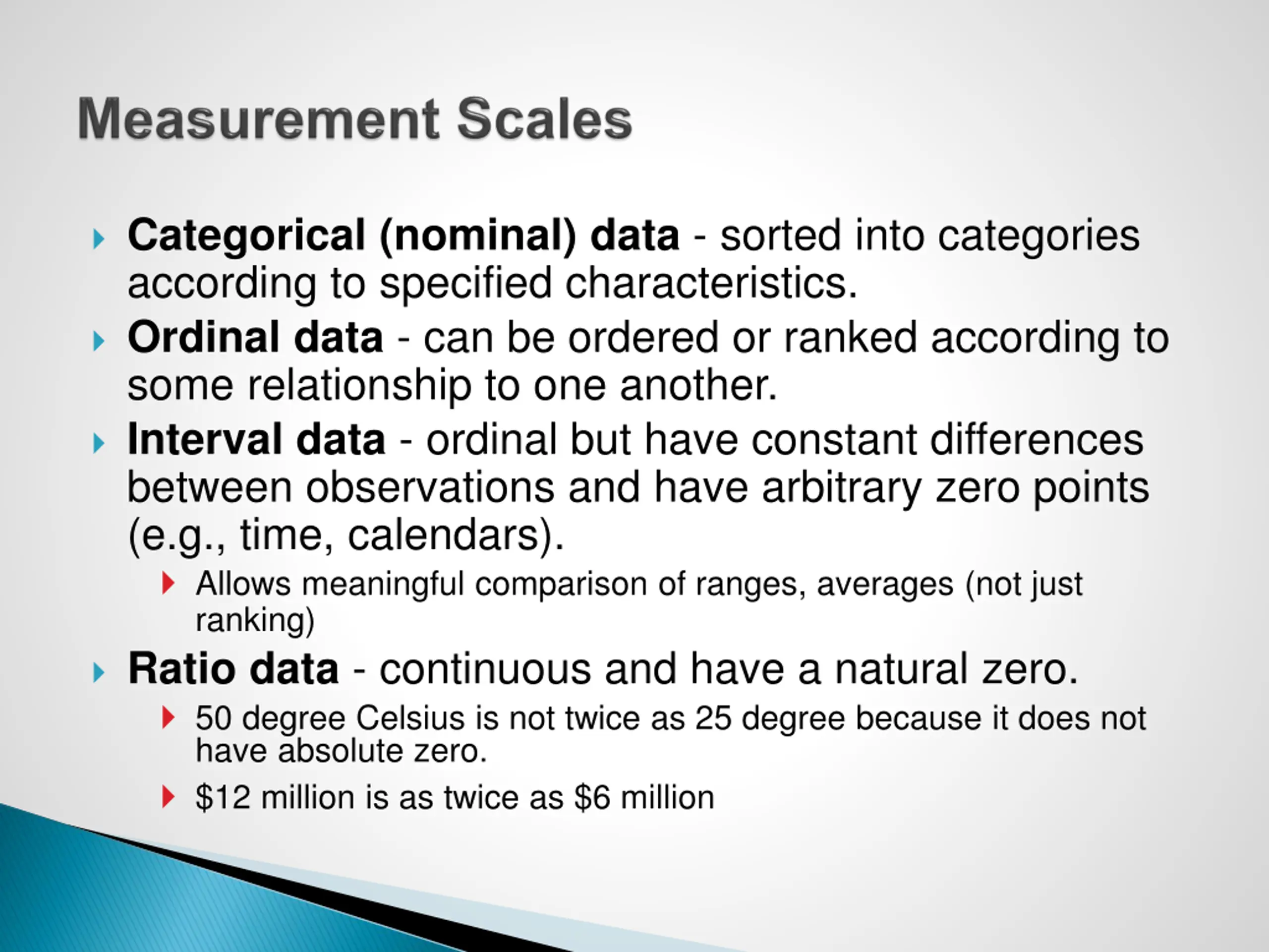 Categorical (nominal) data - sorted into categories according to specified characteristics. Ordinal data - can be ordered or ranked according to some relationship to one another. Interval data - ordinal but have constant differences between observations and have arbitrary zero points (e.g., time, calendars). Allows meaningful comparison of ranges, averages (not just ranking) Ratio data - continuous and have a natural zero. 50 degree Celsius is not twice as 25 degree because it does not have absolute zero. $12 million is as twice as $6 million