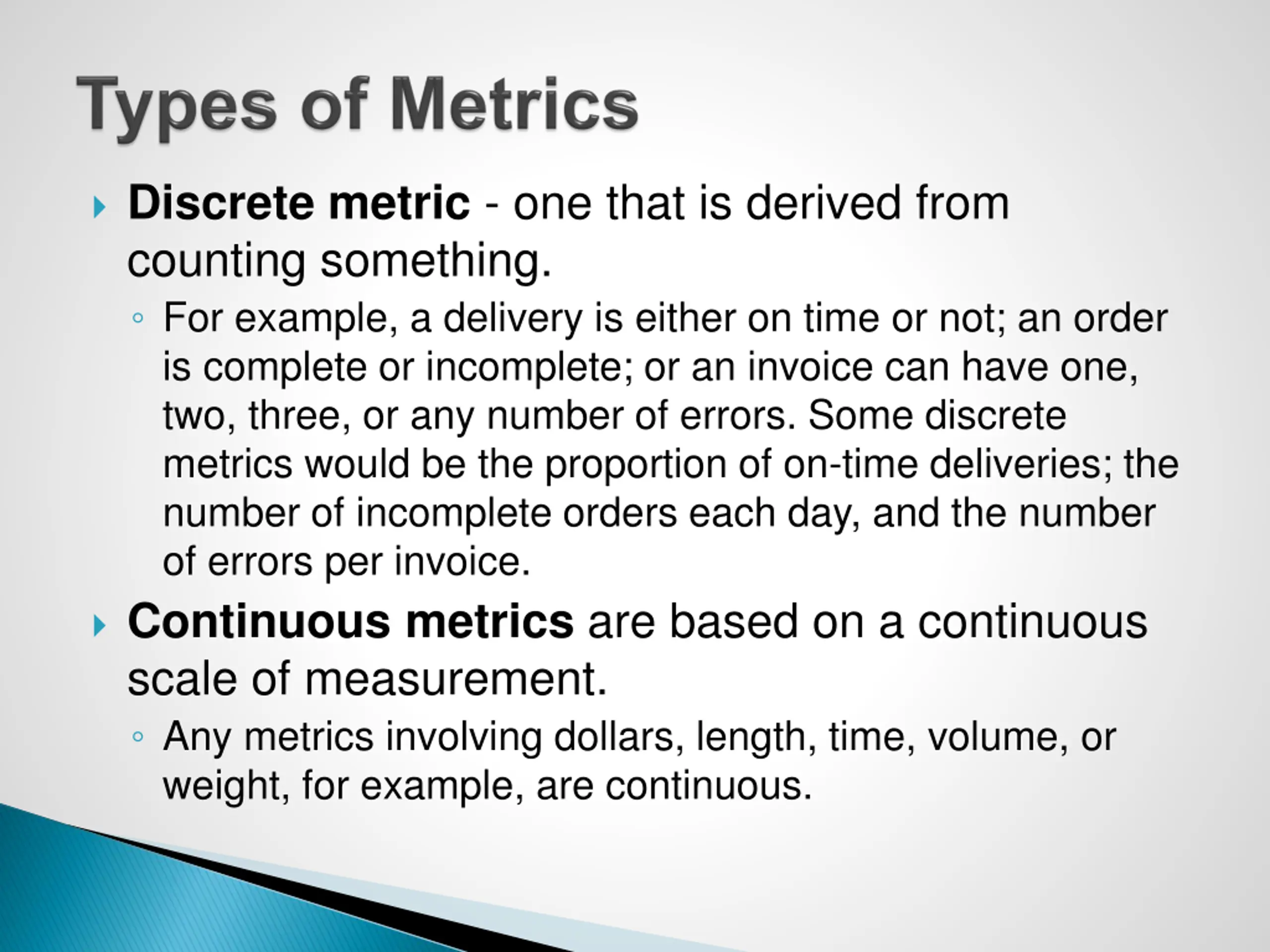 Discrete metric - one that is derived from counting something. For example, a delivery is either on time or not; an order is complete or incomplete; or an invoice can have one, two, three, or any number of errors. Some discrete metrics would be the proportion of on-time deliveries; the number of incomplete orders each day, and the number of errors per invoice. Continuous metrics are based on a continuous scale of measurement. Any metrics involving dollars, length, time, volume, or weight, for example, are continuous.