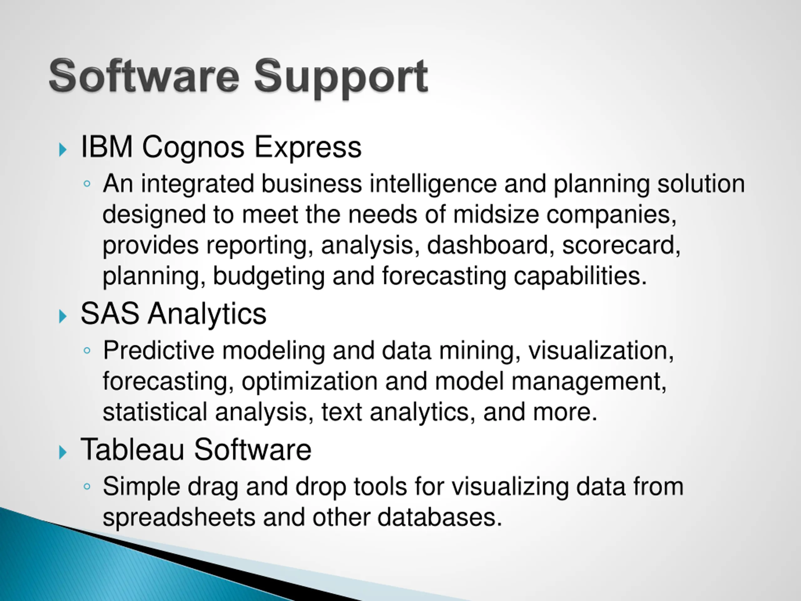 IBM Cognos Express An integrated business intelligence and planning solution designed to meet the needs of midsize companies, provides reporting, analysis, dashboard, scorecard, planning, budgeting and forecasting capabilities. SAS Analytics Predictive modeling and data mining, visualization, forecasting, optimization and model management, statistical analysis, text analytics, and more. Tableau Software Simple drag and drop tools for visualizing data from spreadsheets and other databases.