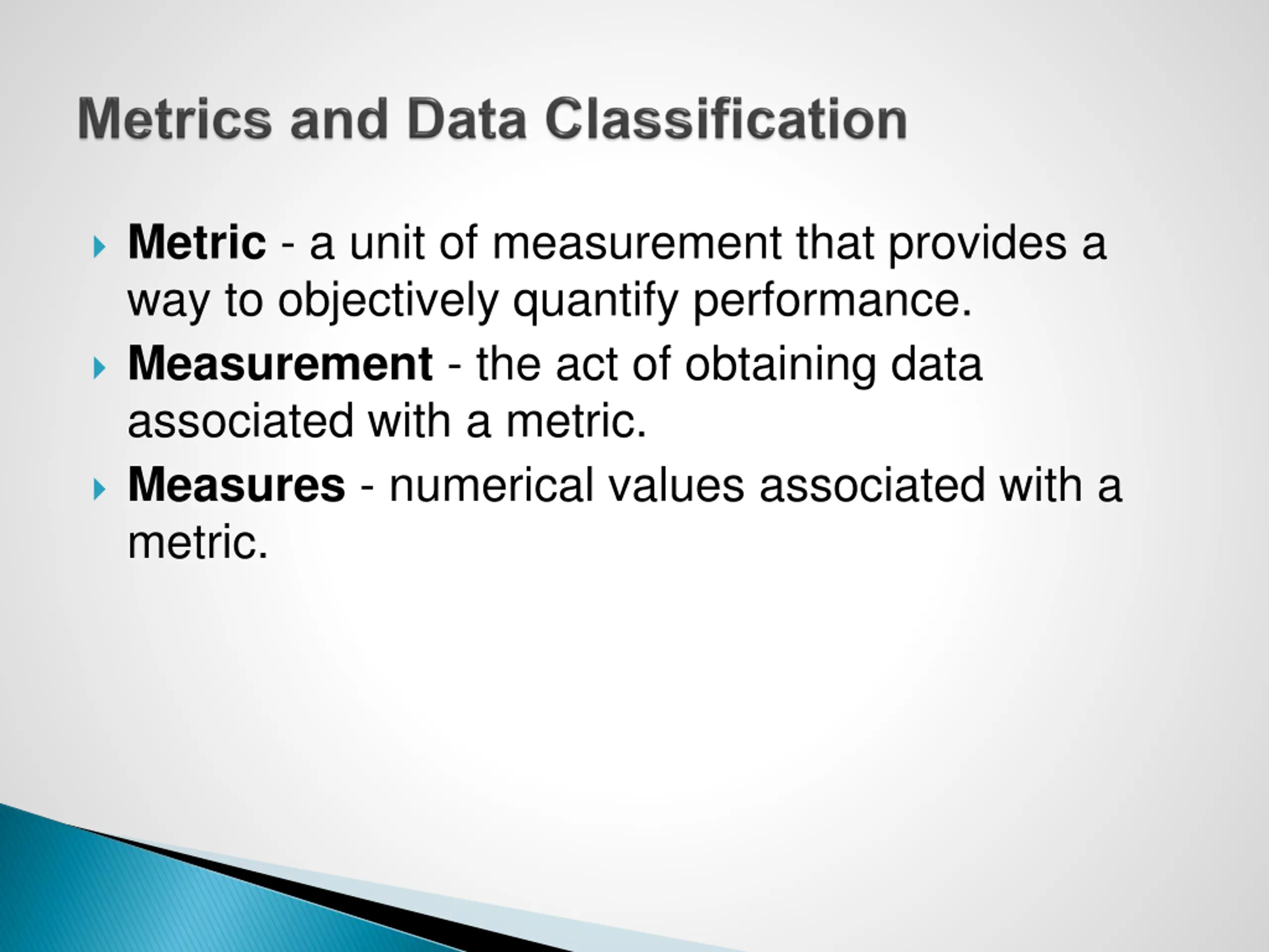 Metric - a unit of measurement that provides a way to objectively quantify performance. Measurement - the act of obtaining data associated with a metric. Measures - numerical values associated with a metric.