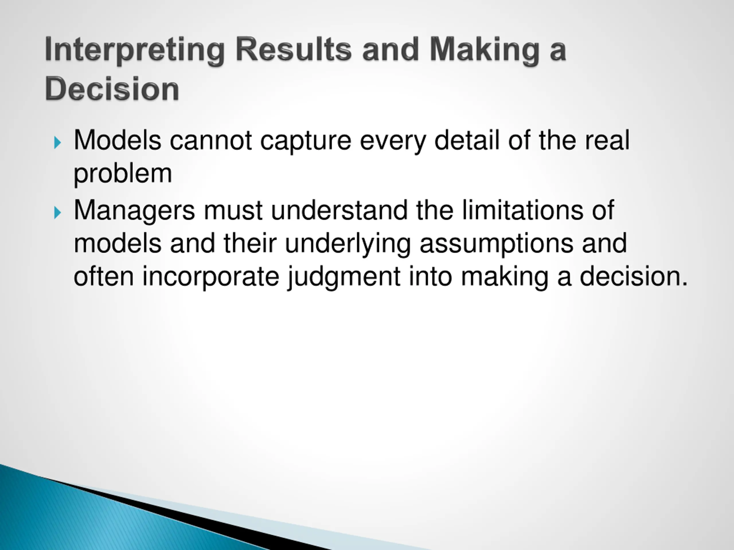 Models cannot capture every detail of the real problem Managers must understand the limitations of models and their underlying assumptions and often incorporate judgment into making a decision.