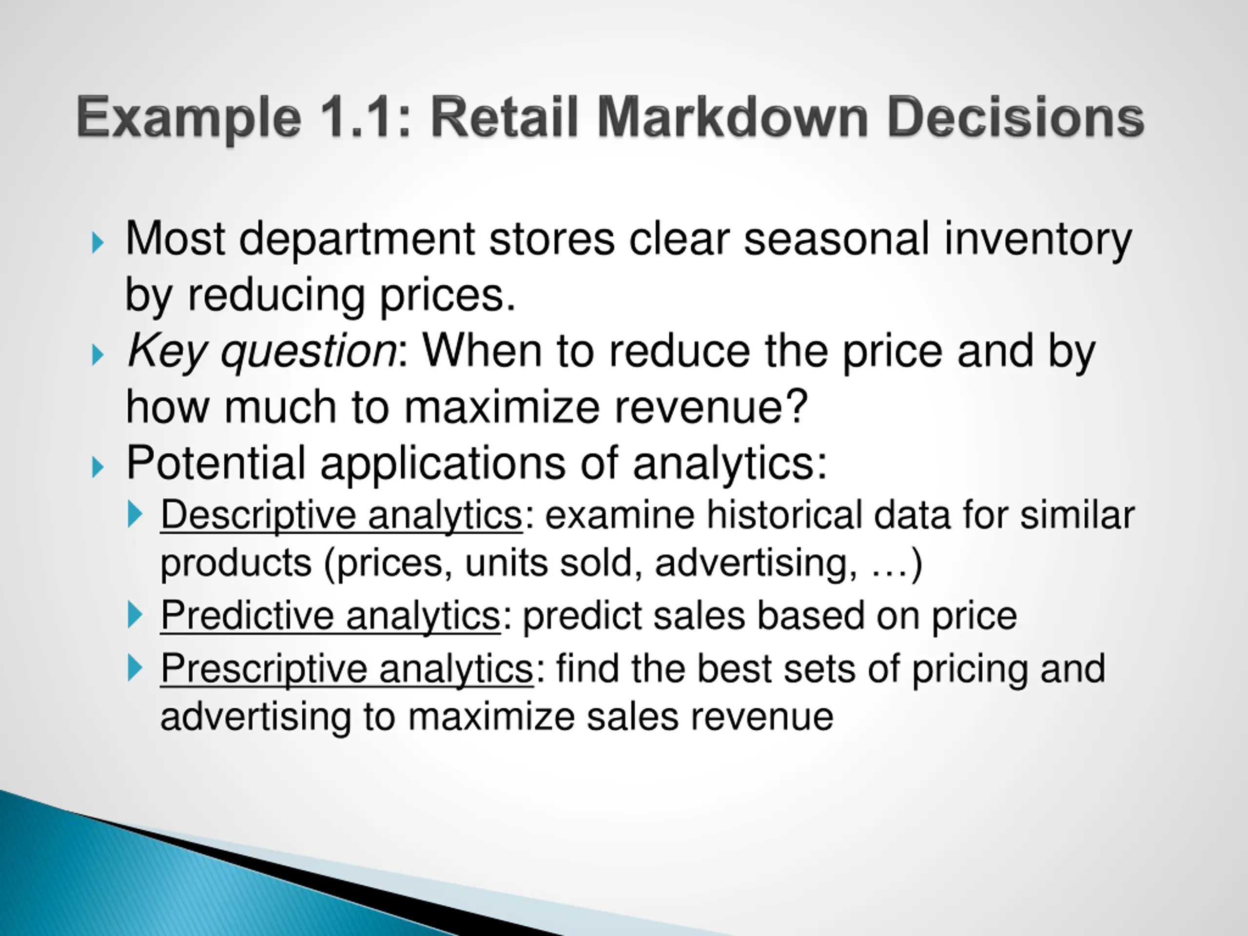 Most department stores clear seasonal inventory by reducing prices. Key question: When to reduce the price and by how much to maximize revenue? Potential applications of analytics: Descriptive analytics: examine historical data for similar products (prices, units sold, advertising, ) Predictive analytics: predict sales based on price Prescriptive analytics: find the best sets of pricing and advertising to maximize sales revenue
