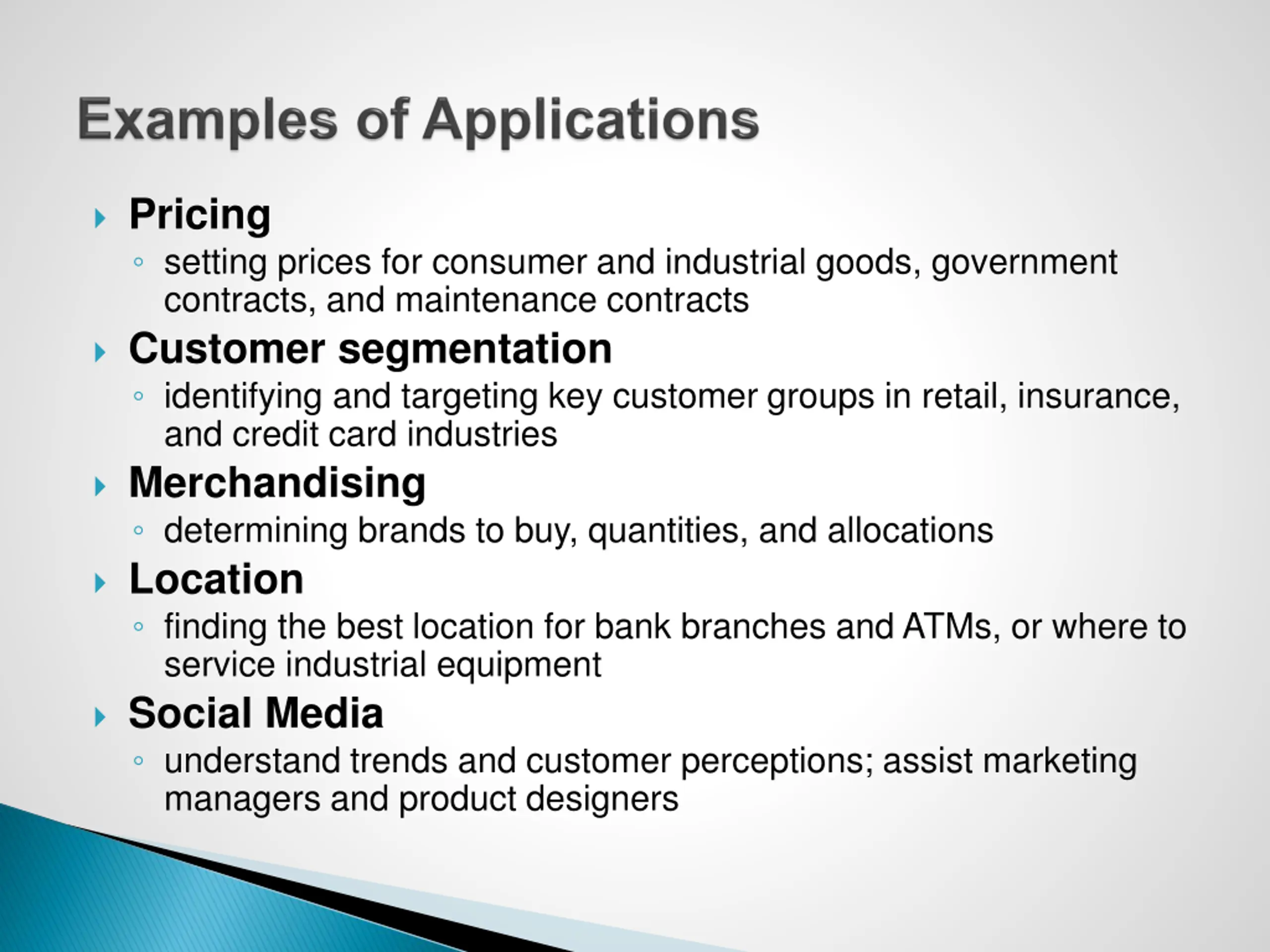 Pricing setting prices for consumer and industrial goods, government contracts, and maintenance contracts Customer segmentation identifying and targeting key customer groups in retail, insurance, and credit card industries Merchandising determining brands to buy, quantities, and allocations Location finding the best location for bank branches and ATMs, or where to service industrial equipment Social Media understand trends and customer perceptions; assist marketing managers and product designers