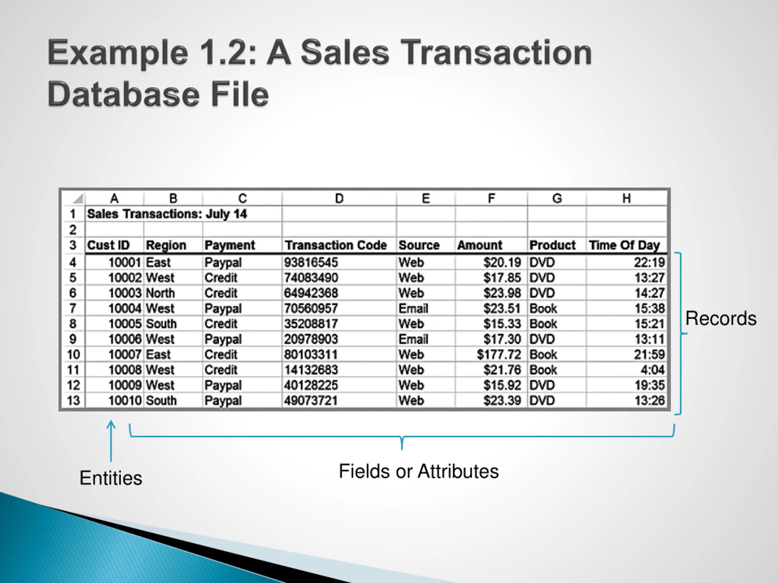 Data set - a collection of data. Examples: Marketing survey responses, a table of historical stock prices, and a collection of measurements of dimensions of a manufactured item. Database - a collection of related files containing records on people, places, or things. A database file is usually organized in a two-dimensional table, where the columns correspond to each individual element of data (called fields, or attributes), and the rows represent records of related data elements.