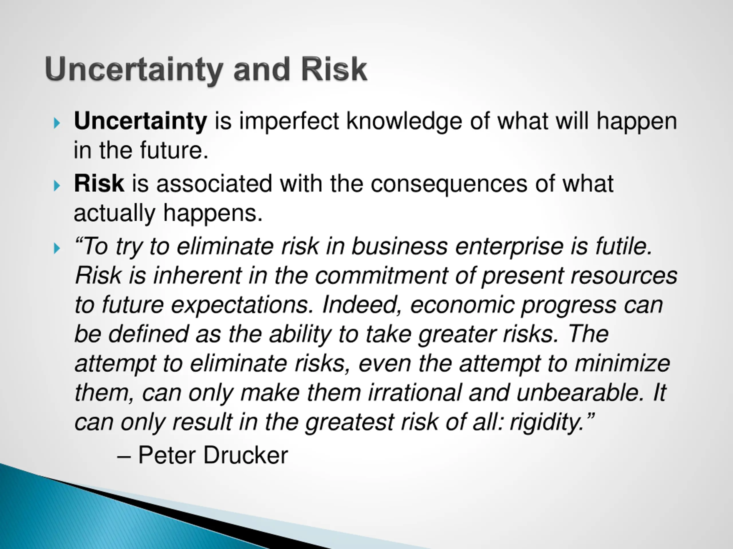 Uncertainty is imperfect knowledge of what will happen in the future. Risk is associated with the consequences of what actually happens. To try to eliminate risk in business enterprise is futile. Risk is inherent in the commitment of present resources to future expectations. Indeed, economic progress can be defined as the ability to take greater risks. The attempt to eliminate risks, even the attempt to minimize them, can only make them irrational and unbearable. It can only result in the greatest risk of all: rigidity. Peter Drucker