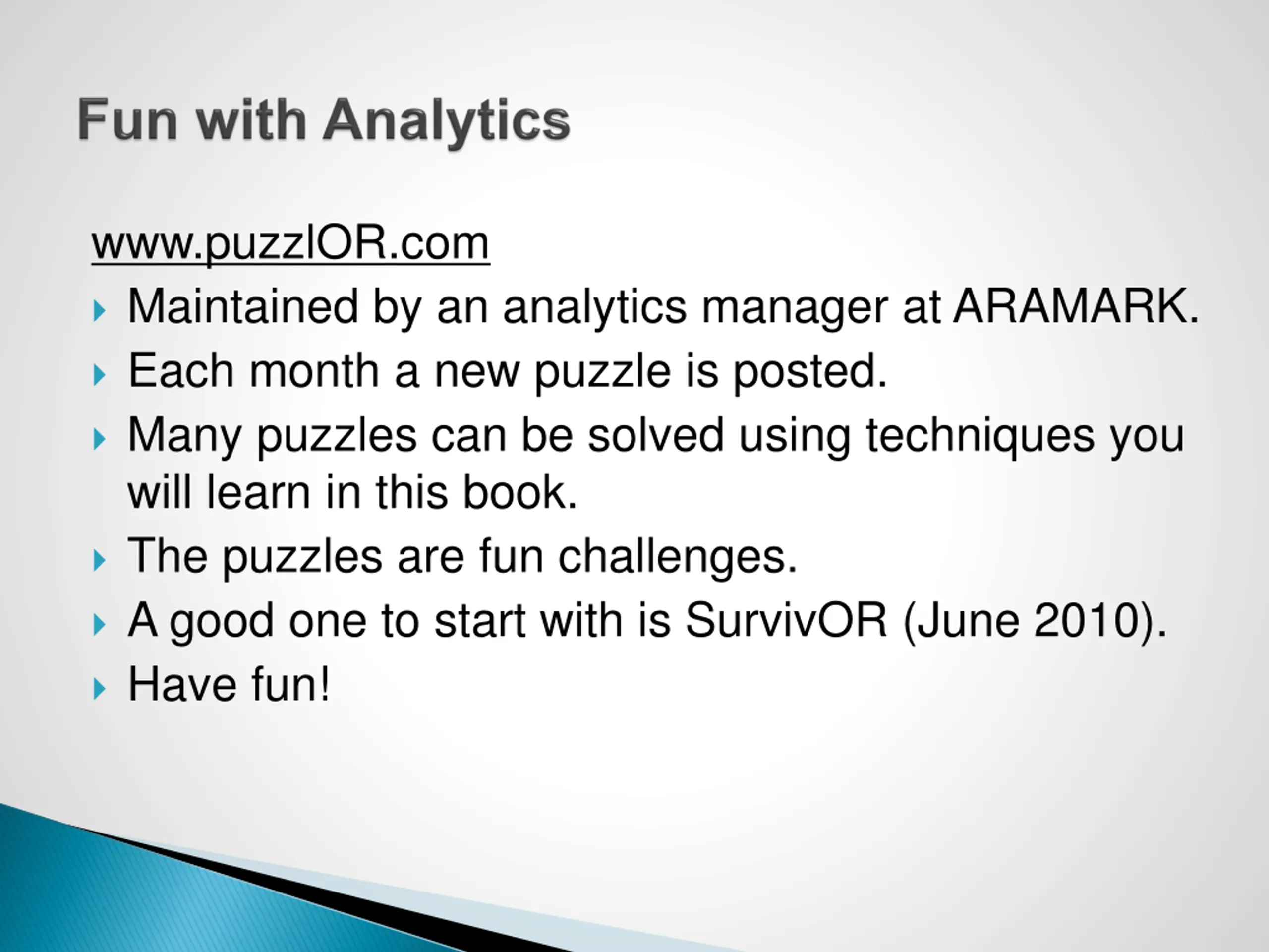 www.puzzlOR.com Maintained by an analytics manager at ARAMARK. Each month a new puzzle is posted. Many puzzles can be solved using techniques you will learn in this book. The puzzles are fun challenges. A good one to start with is SurvivOR (June 2010). Have fun!