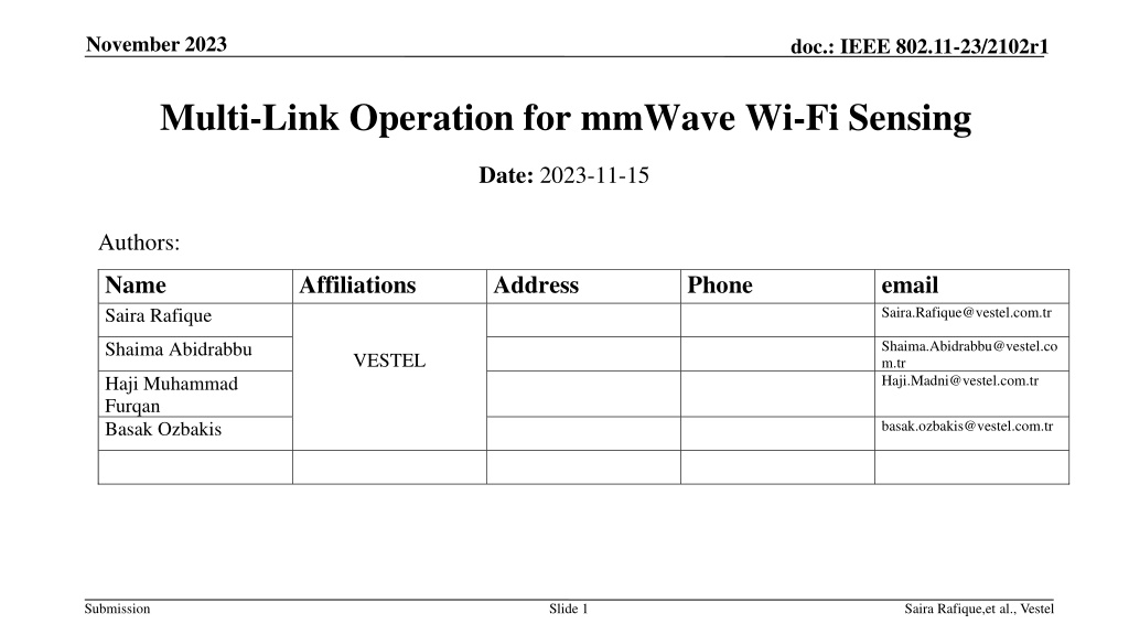 November 2023 doc.: IEEE 802.11-23/2102r1 Multi-Link Operation for mmWave Wi-Fi Sensing Date: 2023-11-15 Authors: Name Saira Rafique Affiliations Address Phone email Saira.Rafique@vestel.com.tr Shaima.Abidrabbu@vestel.co m.tr Haji.Madni@vestel.com.tr Shaima Abidrabbu VESTEL Haji Muhammad Furqan Basak Ozbakis basak.ozbakis@vestel.com.tr Submission Slide 1 Saira Rafique,et al., Vestel