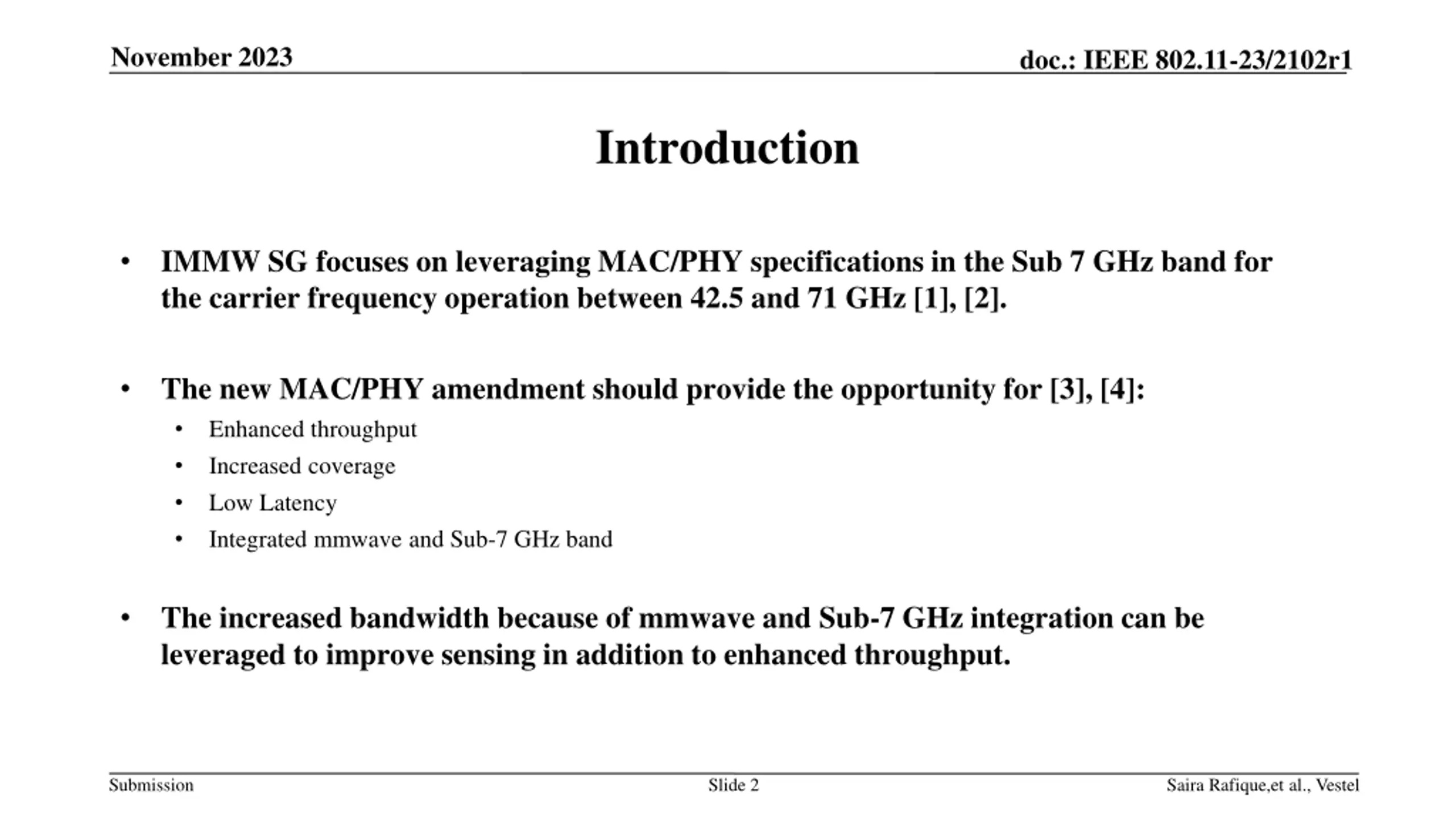 November 2023 doc.: IEEE 802.11-23/2102r1 Introduction IMMW SG focuses on leveraging MAC/PHY specifications in the Sub 7 GHz band for the carrier frequency operation between 42.5 and 71 GHz [1], [2]. The new MAC/PHY amendment should provide the opportunity for [3], [4]: Enhanced throughput Increased coverage Low Latency Integrated mmwave and Sub-7 GHz band The increased bandwidth because of mmwave and Sub-7 GHz integration can be leveraged to improve sensing in addition to enhanced throughput. Submission Slide 2 Saira Rafique,et al., Vestel