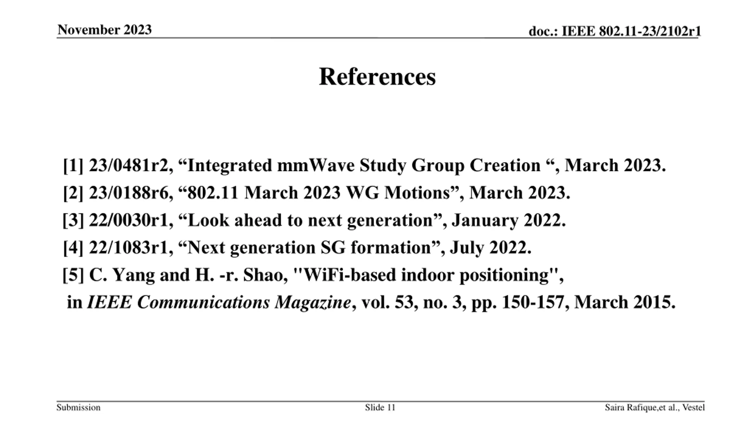 November 2023 doc.: IEEE 802.11-23/2102r1 References [1] 23/0481r2, Integrated mmWave Study Group Creation , March 2023. [2] 23/0188r6, 802.11 March 2023 WG Motions , March 2023. [3] 22/0030r1, Look ahead to next generation , January 2022. [4] 22/1083r1, Next generation SG formation , July 2022. [5] C. Yang and H. -r. Shao, "WiFi-based indoor positioning", in IEEE Communications Magazine, vol. 53, no. 3, pp. 150-157, March 2015. Submission Slide 11 Saira Rafique,et al., Vestel