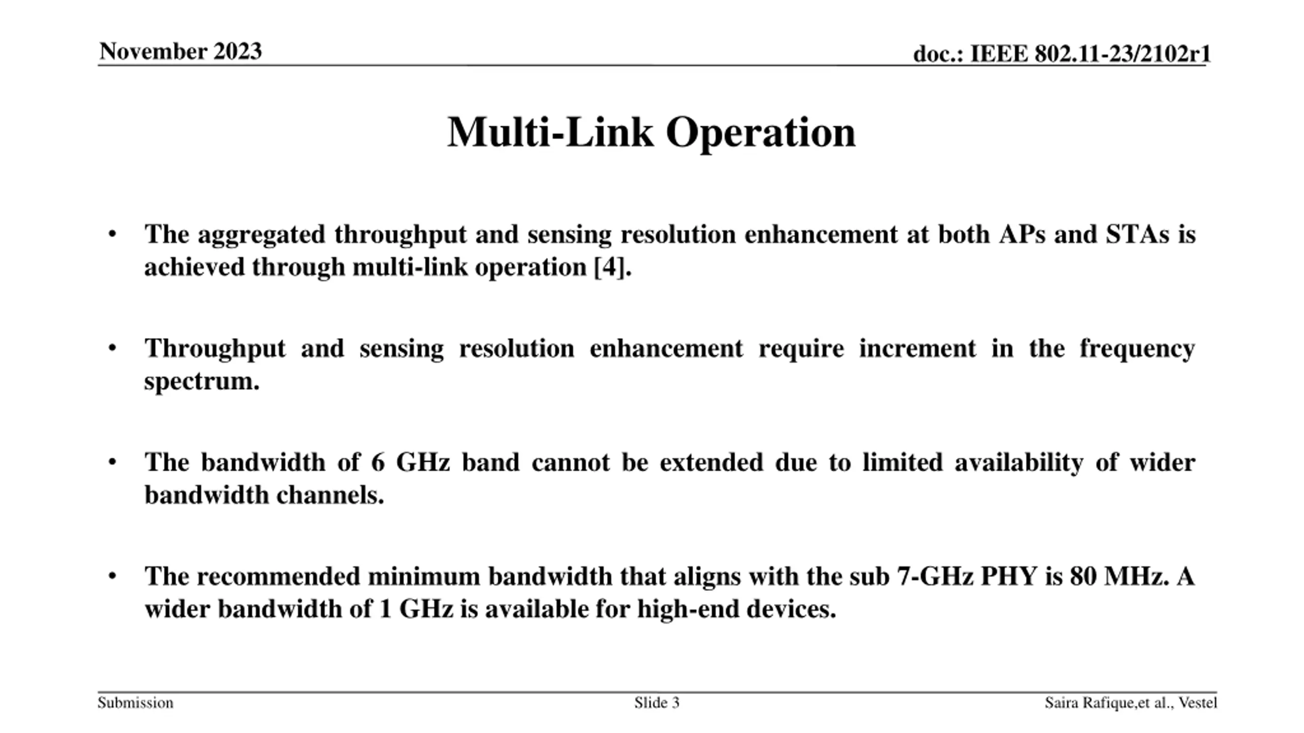 November 2023 doc.: IEEE 802.11-23/2102r1 Multi-Link Operation The aggregated throughput and sensing resolution enhancement at both APs and STAs is achieved through multi-link operation [4]. Throughput and sensing resolution enhancement require increment in the frequency spectrum. The bandwidth of 6 GHz band cannot be extended due to limited availability of wider bandwidth channels. The recommended minimum bandwidth that aligns with the sub 7-GHz PHY is 80 MHz. A wider bandwidth of 1 GHz is available for high-end devices. Submission Slide 3 Saira Rafique,et al., Vestel